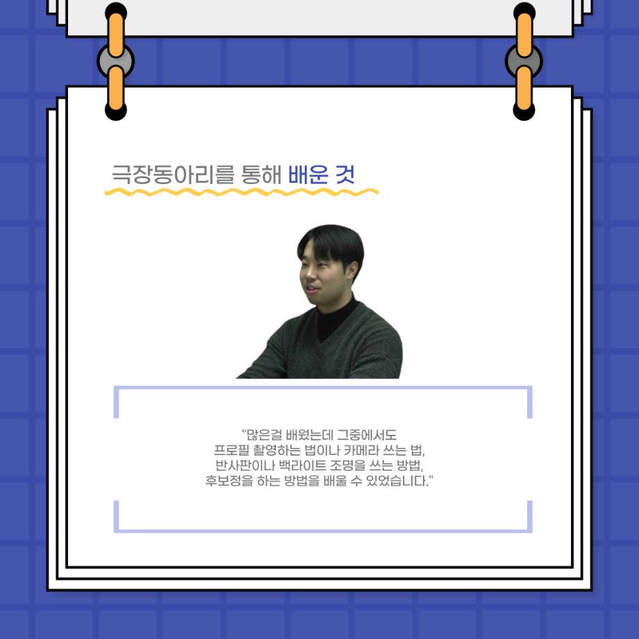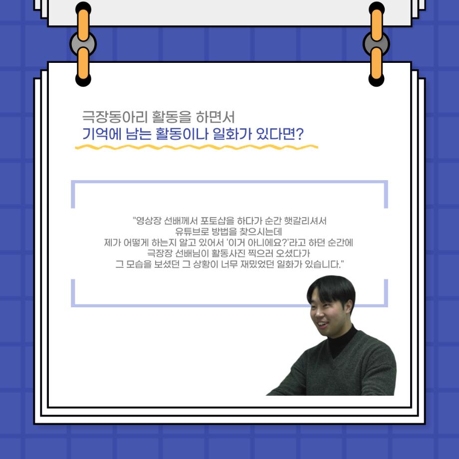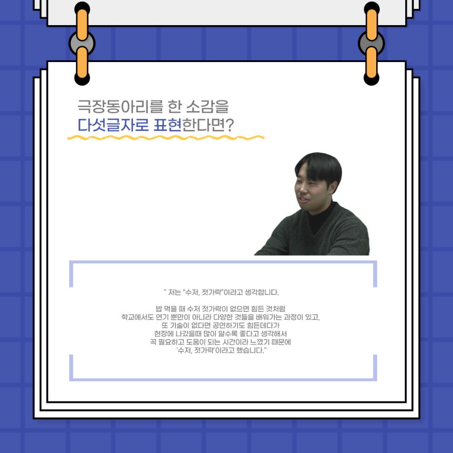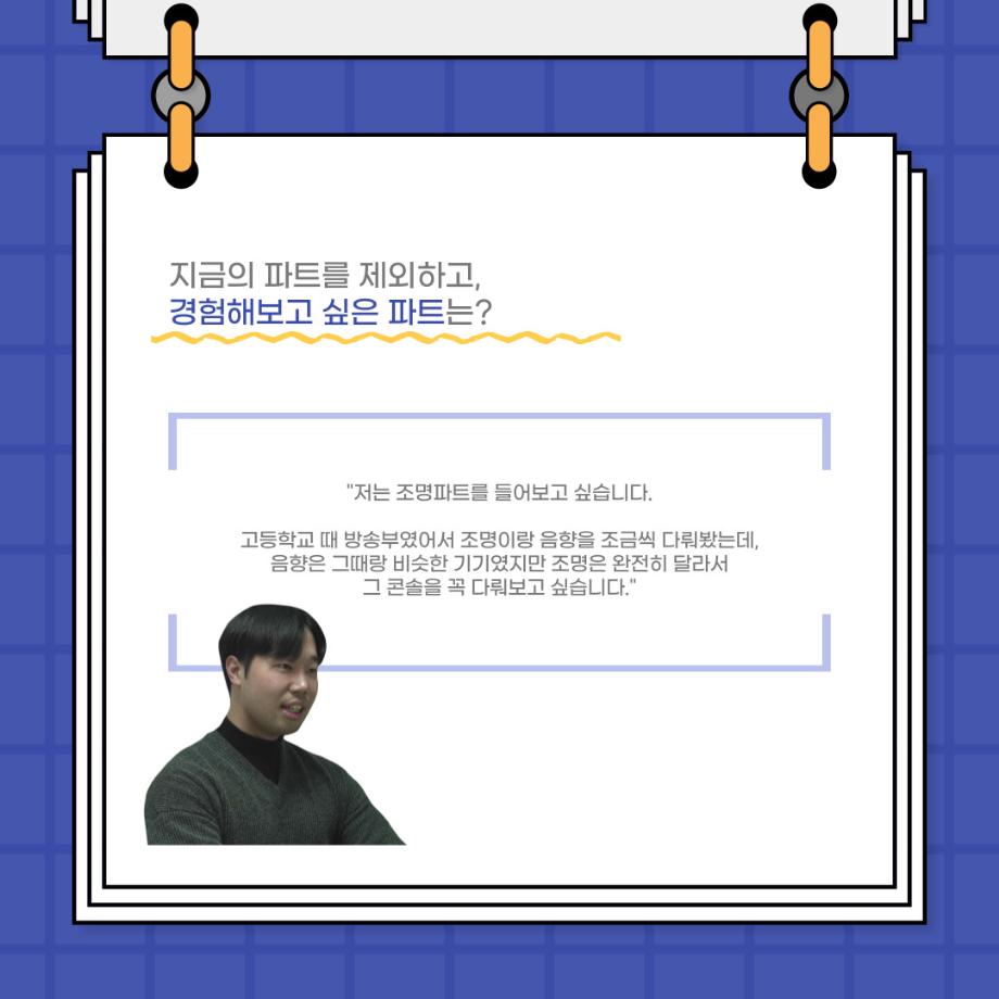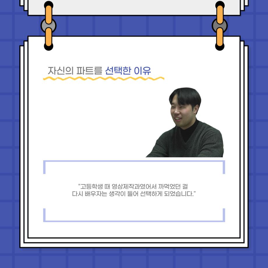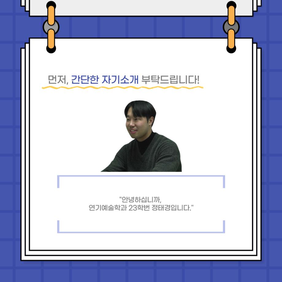 본문 시작 홈으로 커뮤니티 학과소개 입학정보 교수소개 학과과정 커뮤니티 공연예매 안내 홈페이지가이드 포토갤러리 공지사항 포토갤러리 작품DB 동아리 학사일정 학생회 포토갤러리 페이스북 트위터 프린트 사이와의 인터뷰 - 23년도 극장동아리 영상 파트 부원 ‘정태경‘ 연기예술학과 3015 2024-02-02 안녕하십니까. 23년도 학회 ‘사이’입니다. 학회 ‘사이’의 열아홉번째 인터뷰로 연기예술학과 23년도 극장동아리 영상 파트 부원인 정태경 학생과 인터뷰하는 시간을 가졌습니다. 이번 인터뷰에서는 영상파트를 선택한 이유, 극장동아리를 통해 배운 것, 동아리를 하면서 기억에 남는 활동이나 일화 등에 대해 인터뷰하였습니다. 다음 인터뷰 컨텐츠 ‘사인’도 많은 사랑 부탁드립니다. 목록 이전세명대학교 연기예술학과 특강 [김지인 캐스팅 디렉터님] 다음 사이와의 인터뷰 - 23년도 졸업작품 학생연출 ‘박찬우‘ 담당부서 : 연기예술학과 담당자 : - 연락처 : 043-649-1733 최종수정일 : 2024-10-26 만족도조사 만족도 조사 이 페이지에서 제공하는 정보에 대하여 만족하시나요? 매우만족 만족 보통 불만족 매우불만족