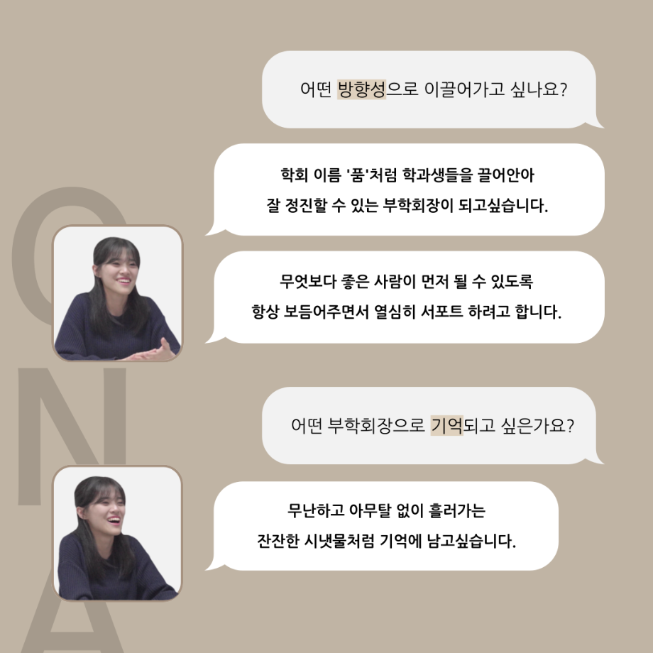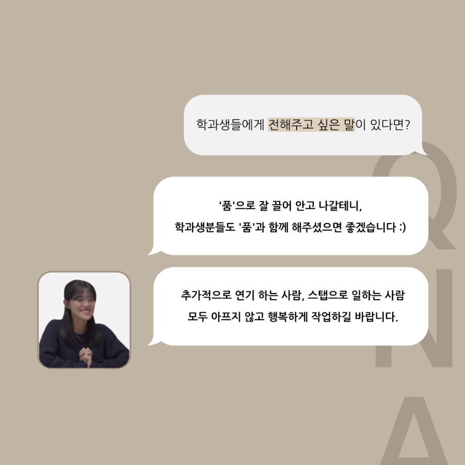 본문 시작 홈으로 커뮤니티 학과소개 입학정보 교수소개 학과과정 커뮤니티 공연예매 안내 홈페이지가이드 포토갤러리 공지사항 포토갤러리 작품DB 동아리 학사일정 학생회 포토갤러리 페이스북 트위터 프린트 '품'위있는 인'터뷰' - 24년도 부학회장 <최가람> 연기예술학과 3361 2024-07-10 안녕하십니까. 24년도 학회 ‘품‘ 입니다. 학회 ‘품’의 두 번째 인터뷰로 세명대학교 연기예술학과 24학년도 부학회장인 최가람 학우와 인터뷰 하는 시간을 가졌습니다. 부학회장으로서의 각오, 방향성 그리고 학과생에게 전하고 싶은 말과 학회에게 남기는 메세지 등을 질문하는 시간을 가졌습니다. 앞으로 있을 인터뷰 컨텐츠인 ‘품터뷰’ 많은 사랑 부탁드립니다. 목록 이전2024학년도 하계방학 진로, 취업 LMS 특강 다음 '품'위있는 인'터뷰' - 24년도 극장장 <이종화> 담당부서 : 연기예술학과 담당자 : - 연락처 : 043-649-1733 최종수정일 : 2024-10-26 만족도조사 만족도 조사 이 페이지에서 제공하는 정보에 대하여 만족하시나요? 매우만족 만족 보통 불만족 매우불만족