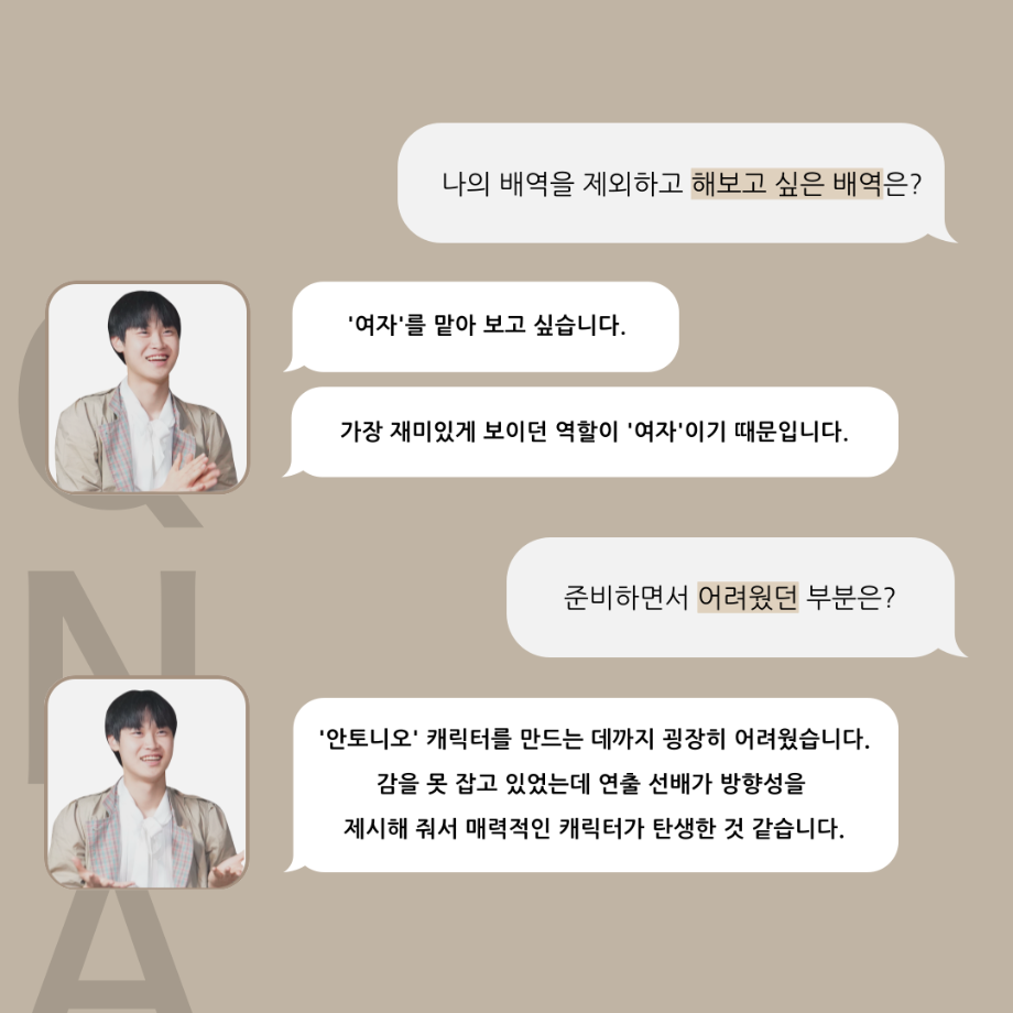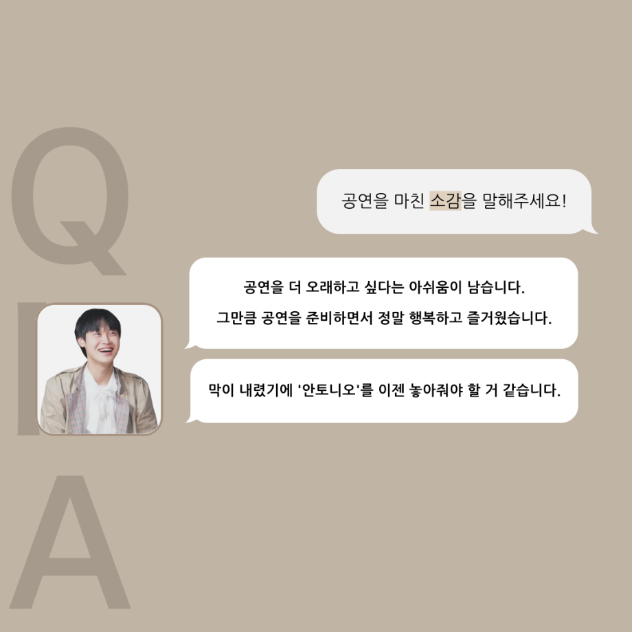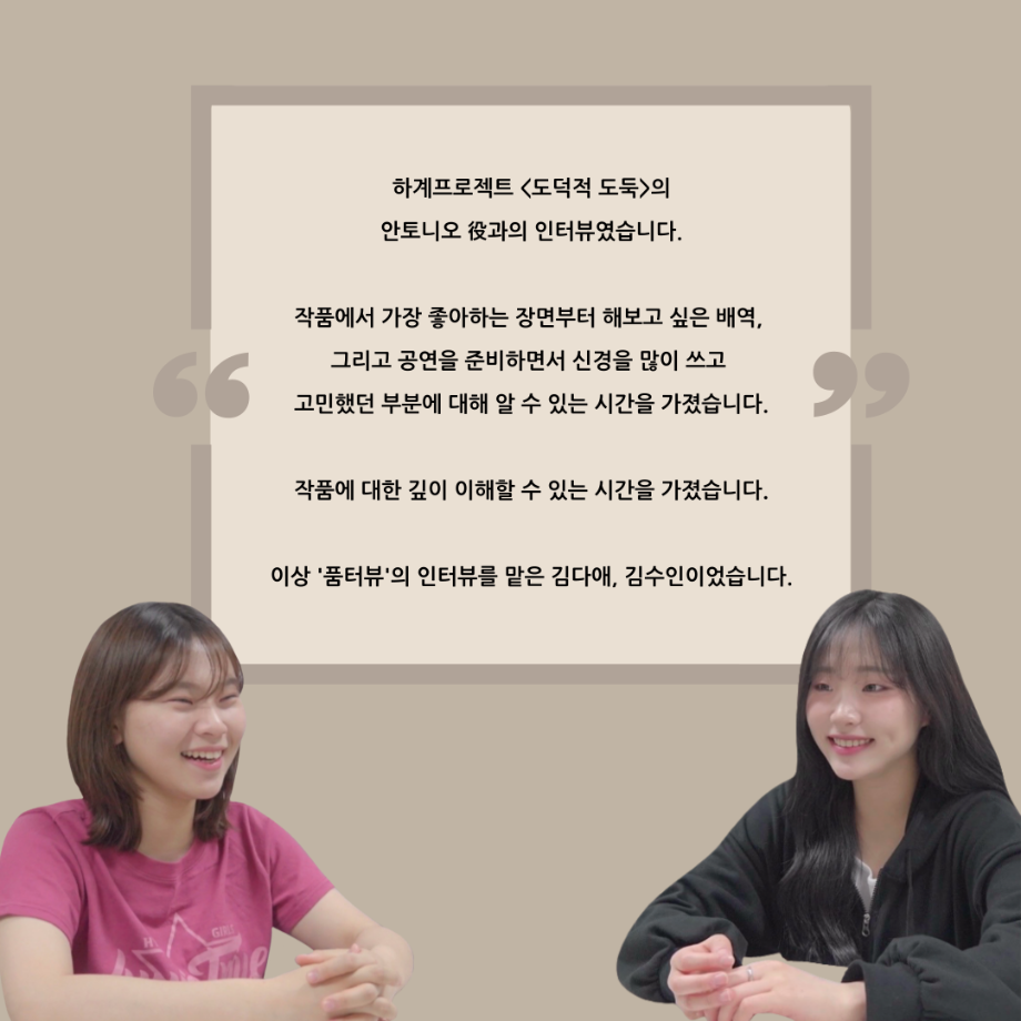본문 시작 홈으로 커뮤니티 학과소개 입학정보 교수소개 학과과정 커뮤니티 공연예매 안내 홈페이지가이드 포토갤러리 공지사항 포토갤러리 작품DB 동아리 학사일정 학생회 포토갤러리 페이스북 트위터 프린트 ‘품’위있는 인‘터뷰’ - 하계프로젝트 안토니오役 <정준혁> 연기예술학과 3217 2024-09-19 안녕하십니까. 24년도 학회 ‘품’ 입니다. 학회 ‘품’의 열 다섯 번째 인터뷰로 세명대학교 연기예술학과 하계프로젝트 <도덕적 도둑> 의 안토니오 역인 정준혁 학우와 인터뷰 하는 시간을 가졌습니다. 가장 좋아하는 장면, 자신의 배역을 제외하고 해보고 싶은 배역 그리고 준비하면서 어려웠던 부분과 공연을 마친 소감 등에 대해 인터뷰 하는 시간을 가졌습니다. 앞으로 있을 인터뷰 컨텐츠인 ‘품터뷰’ 많은 사랑 부탁드립니다. 목록 이전‘품’위있는 인‘터뷰’ - 하계프로젝트 도둑役 <박상훈> 다음 연기예술학과, 충북도립극단과 업무협약(MOU) 체결 담당부서 : 연기예술학과 담당자 : - 연락처 : 043-649-1733 최종수정일 : 2024-10-26 만족도조사 만족도 조사 이 페이지에서 제공하는 정보에 대하여 만족하시나요? 매우만족 만족 보통 불만족 매우불만족
