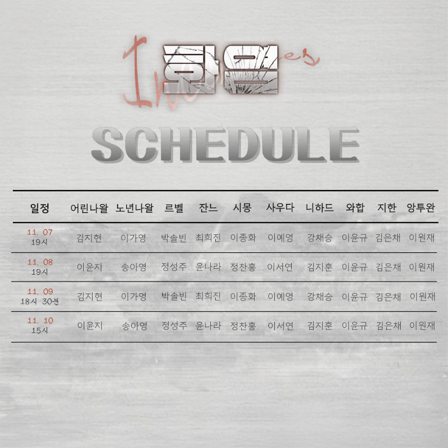 본문 시작 홈으로 커뮤니티 학과소개 입학정보 교수소개 학과과정 커뮤니티 공연예매 안내 홈페이지가이드 포토갤러리 공지사항 포토갤러리 작품DB 동아리 학사일정 학생회 포토갤러리 페이스북 트위터 프린트 제 17회 세명대학교 연기예술학과 졸업작품 <화염> 스케줄표 연기예술학과 3225 2024-11-06 우리 함께 있으니, 모든게 나아질거야. - 공연일시 A CAST 11.08(금) 19:00 11.10(일) 15:00 B CAST 11.07(목) 19:00 11.09(토) 18:30 서울 대학로 민송아트홀 1관 목록 이전제 17회 세명대학교 연기예술학과 졸업작품 <화염> 포스터 & 캐스트 다음 2024학년도 집단심층토의FGI“세명톡톡TALK TALK” 참여자 모집 담당부서 : 연기예술학과 담당자 : - 연락처 : 043-649-1733 최종수정일 : 2024-10-26 만족도조사 만족도 조사 이 페이지에서 제공하는 정보에 대하여 만족하시나요? 매우만족 만족 보통 불만족 매우불만족