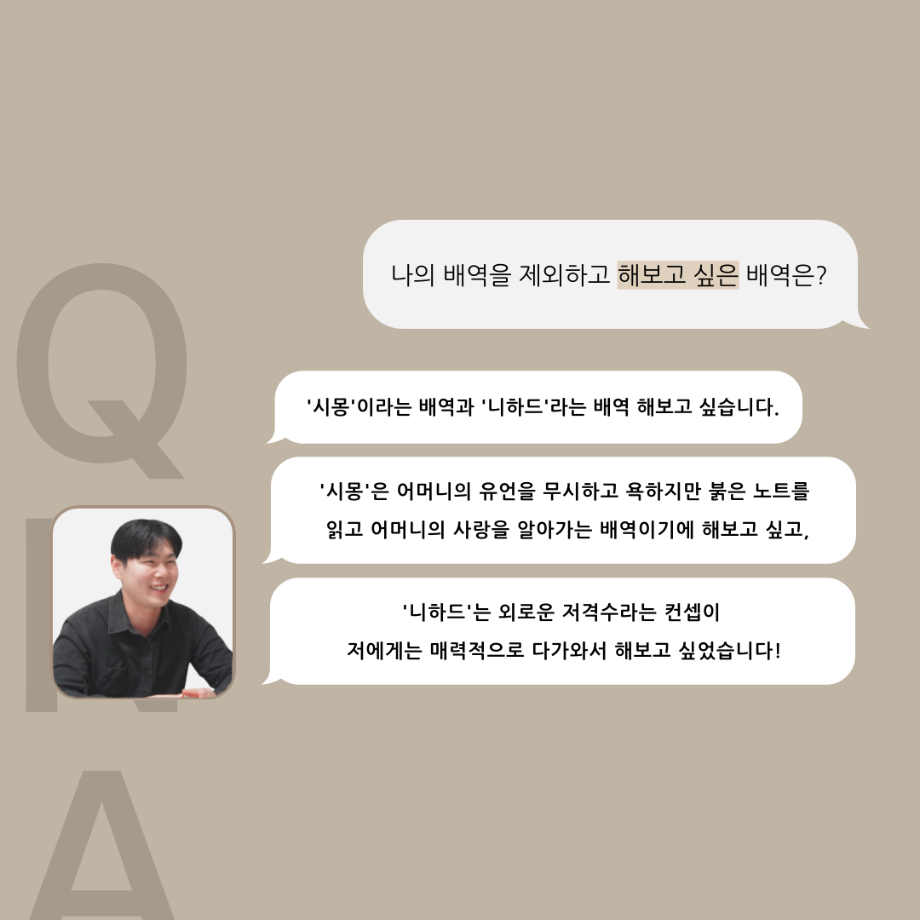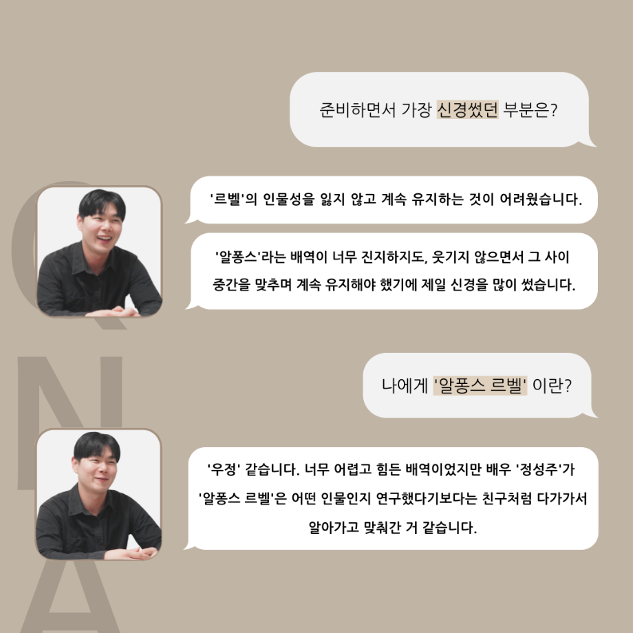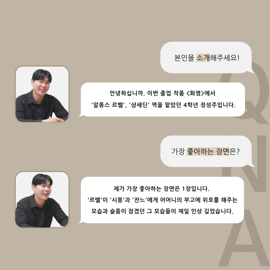 본문 시작 홈으로 커뮤니티 학과소개 입학정보 교수소개 학과과정 커뮤니티 공연예매 안내 홈페이지가이드 포토갤러리 공지사항 포토갤러리 작품DB 동아리 학사일정 학생회 포토갤러리 페이스북 트위터 프린트 ‘품’위있는 인‘터뷰’ - 24년도 졸업작품 르벨 役 <정성주> 연기예술학과 3378 2024-12-20 안녕하십니까. 24년도 학회 ‘품’ 입니다. 학회 ‘품’의 열 여덟 번째 인터뷰로 세명대학교 연기예술학과 제 17회 졸업작품 <화염>의 르벨 역인 정성주 학우와 인터뷰 하는 시간을 가졌습니다. 가장 좋아하는 장면, 자신의 배역을 제외하고 해보고 싶은 배역 그리고 준비하면서 어려웠던 부분과 공연을 마친 소감 등에 대해 인터뷰 하는 시간을 가졌습니다. 앞으로 있을 인터뷰 컨텐츠인 ‘품터뷰’ 많은 사랑 부탁드립니다. 목록 이전‘품’위있는 인‘터뷰’ - 24년도 졸업작품 어린나왈 役 <이윤지> 다음 ‘품’위있는 인‘터뷰’ - 24년도 졸업작품 잔느 役 <최희진> 담당부서 : 연기예술학과 담당자 : - 연락처 : 043-649-1733 최종수정일 : 2024-10-26 만족도조사 만족도 조사 이 페이지에서 제공하는 정보에 대하여 만족하시나요? 매우만족 만족 보통 불만족 매우불만족