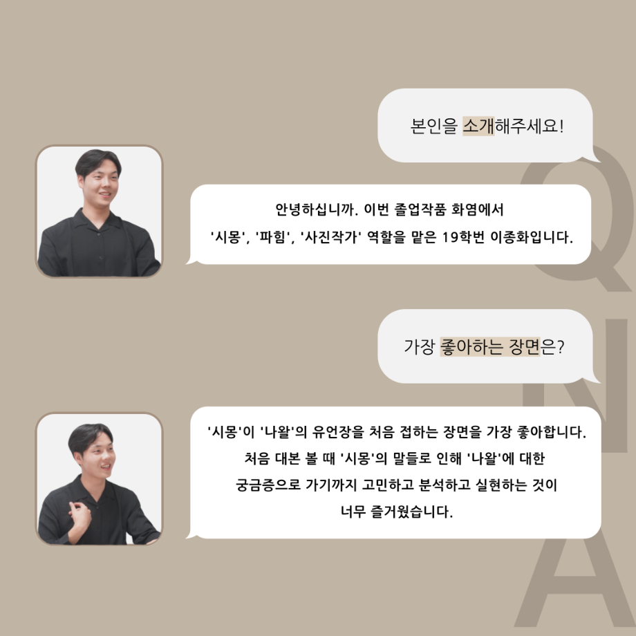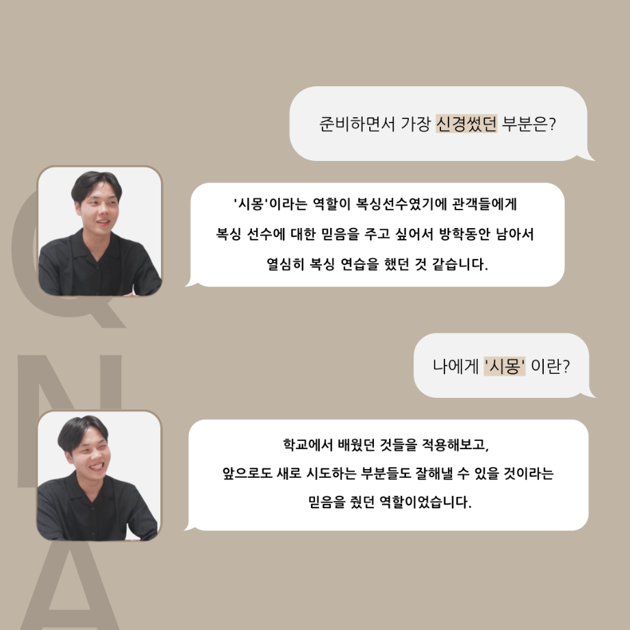 본문 시작 홈으로 커뮤니티 학과소개 입학정보 교수소개 학과과정 커뮤니티 공연예매 안내 홈페이지가이드 포토갤러리 공지사항 포토갤러리 작품DB 동아리 학사일정 학생회 포토갤러리 페이스북 트위터 프린트 ‘품’위있는 인‘터뷰’ - 24년도 졸업작품 시몽 役 <이종화> 연기예술학과 3458 2024-12-24 안녕하십니까. 24년도 학회 ‘품’ 입니다. 학회 ‘품’의 스무 번째 인터뷰로 세명대학교 연기예술학과 제 17회 졸업작품 <화염>의 시몽 역인 이종화 학우와 인터뷰 하는 시간을 가졌습니다. 가장 좋아하는 장면, 자신의 배역을 제외하고 해보고 싶은 배역 그리고 준비하면서 어려웠던 부분과 공연을 마친 소감 등에 대해 인터뷰 하는 시간을 가졌습니다. 앞으로 있을 인터뷰 컨텐츠인 ‘품터뷰’ 많은 사랑 부탁드립니다. 목록 이전‘품’위있는 인‘터뷰’ - 24년도 졸업작품 잔느 役 <최희진> 다음 세명대학교 연기예술학과 정시모집 담당부서 : 연기예술학과 담당자 : - 연락처 : 043-649-1733 최종수정일 : 2024-10-26 만족도조사 만족도 조사 이 페이지에서 제공하는 정보에 대하여 만족하시나요? 매우만족 만족 보통 불만족 매우불만족