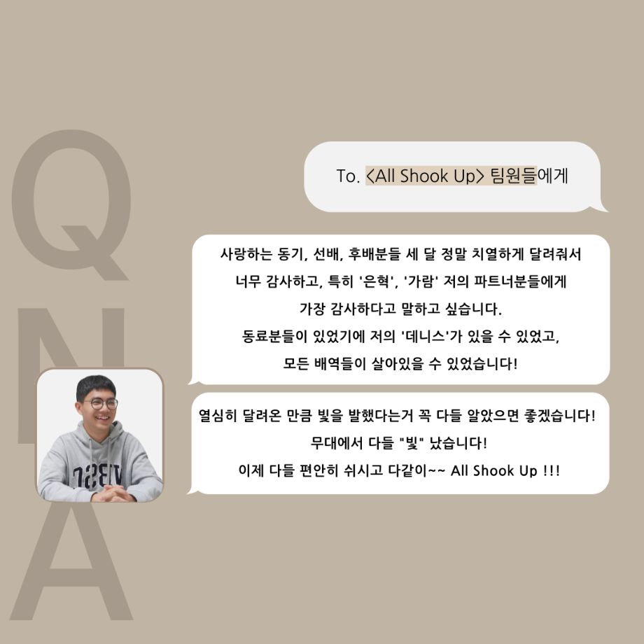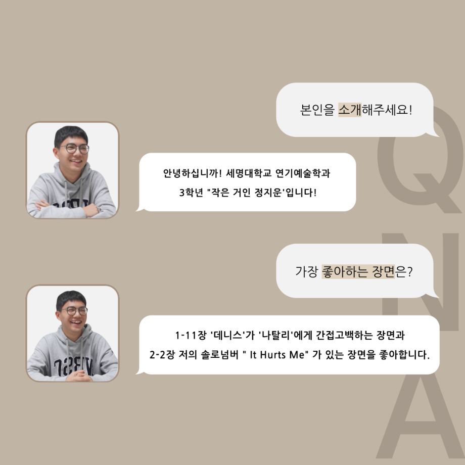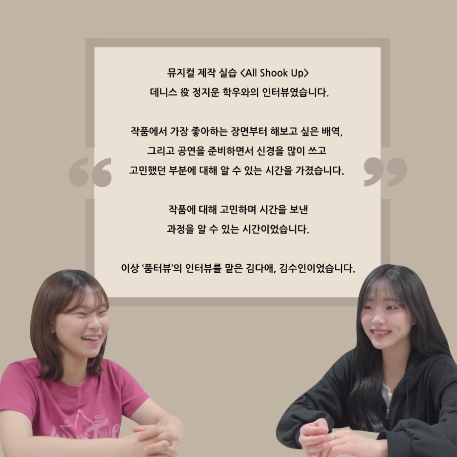 본문 시작 홈으로 커뮤니티 학과소개 입학정보 교수소개 학과과정 커뮤니티 공연예매 안내 홈페이지가이드 포토갤러리 공지사항 포토갤러리 작품DB 동아리 학사일정 학생회 포토갤러리 페이스북 트위터 프린트 ‘품’ 위 있는 인 ‘터뷰’ - 뮤지컬 제작실습 <올슉업> 데니스정지운 카드 뉴스 연기예술학과 2887 2025-01-17 . 목록 이전‘품’ 위 있는 인 ‘터뷰’ - 뮤지컬 제작실습 <올슉업> 나탈리 안수연 카드 뉴스 다음 2024학년도 공연영상학과 (현 연기예술학과) 학과수여식 담당부서 : 연기예술학과 담당자 : - 연락처 : 043-649-1733 최종수정일 : 2024-10-26 만족도조사 만족도 조사 이 페이지에서 제공하는 정보에 대하여 만족하시나요? 매우만족 만족 보통 불만족 매우불만족