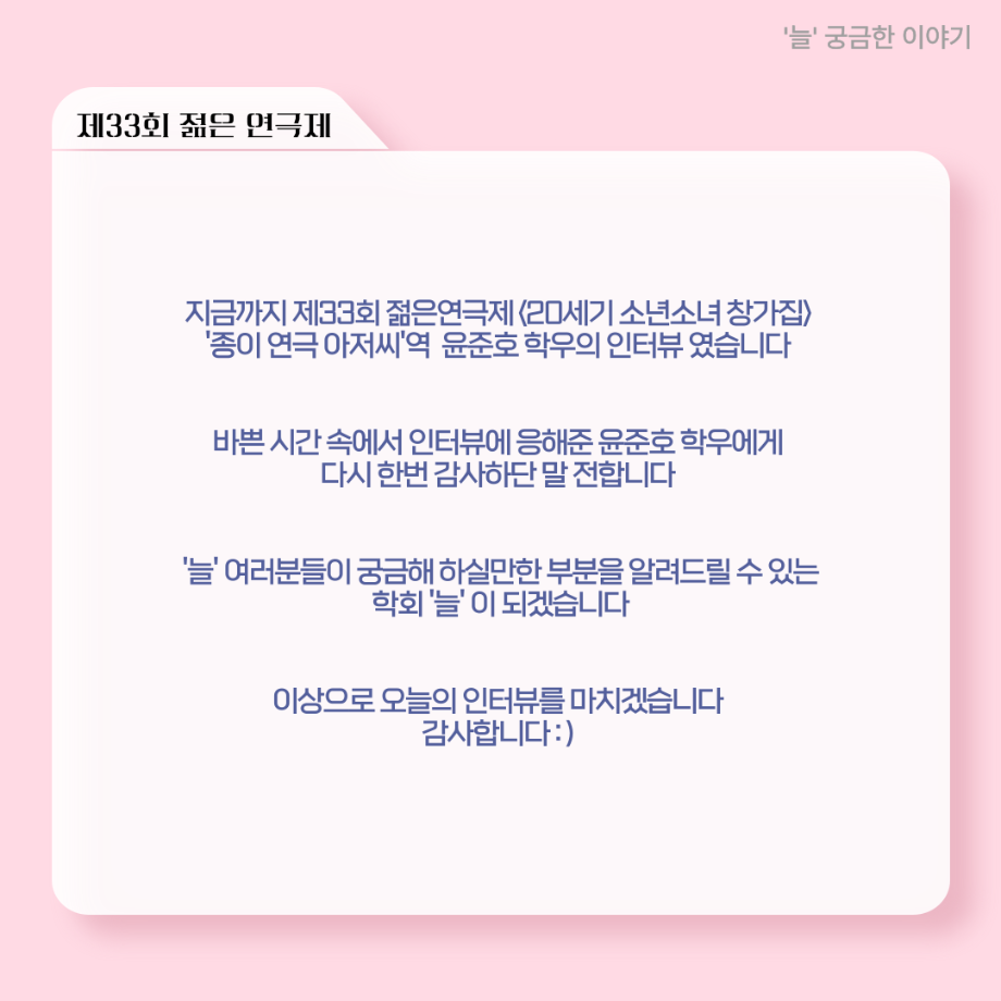 본문 시작 홈으로 커뮤니티 학과소개 입학정보 교수소개 학과과정 커뮤니티 공연예매 안내 홈페이지가이드 포토갤러리 공지사항 포토갤러리 작품DB 동아리 학사일정 학생회 포토갤러리 페이스북 트위터 프린트 ‘늘‘ 궁금한 이야기 - 젊은연극제 ‘20세기 소년소녀 창가집’ 종이연극 아저씨 役 < 윤준호 > 연기예술학과 1459 2025-08-28 . 목록 이전‘늘‘ 궁금한 이야기 - 젊은연극제 ‘20세기 소년소녀 창가집’ 사이토 役 < 박신현 > 다음 ‘늘‘ 궁금한 이야기 - 젊은연극제 ‘20세기 소년소녀 창가집’ 다큐pd 役 < 임재완 > 담당부서 : 연기예술학과 담당자 : - 연락처 : 043-649-1733 최종수정일 : 2024-10-26 만족도조사 만족도 조사 이 페이지에서 제공하는 정보에 대하여 만족하시나요? 매우만족 만족 보통 불만족 매우불만족