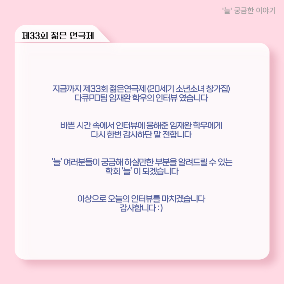본문 시작 홈으로 커뮤니티 학과소개 입학정보 교수소개 학과과정 커뮤니티 공연예매 안내 홈페이지가이드 포토갤러리 공지사항 포토갤러리 작품DB 동아리 학사일정 학생회 포토갤러리 페이스북 트위터 프린트 ‘늘‘ 궁금한 이야기 - 젊은연극제 ‘20세기 소년소녀 창가집’ 다큐pd 役 < 임재완 > 연기예술학과 1143 2025-09-12 . 목록 이전‘늘‘ 궁금한 이야기 - 젊은연극제 ‘20세기 소년소녀 창가집’ 종이연극 아저씨 役 < 윤준호 > 다음 ‘늘‘ 궁금한 이야기 - 현장실습 < 이종서 > 담당부서 : 연기예술학과 담당자 : - 연락처 : 043-649-1733 최종수정일 : 2024-10-26 만족도조사 만족도 조사 이 페이지에서 제공하는 정보에 대하여 만족하시나요? 매우만족 만족 보통 불만족 매우불만족