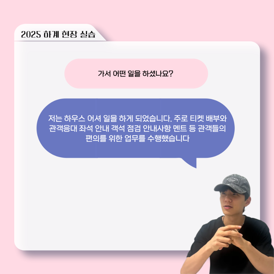 본문 시작 홈으로 커뮤니티 학과소개 입학정보 교수소개 학과과정 커뮤니티 공연예매 안내 홈페이지가이드 포토갤러리 공지사항 포토갤러리 작품DB 동아리 학사일정 학생회 포토갤러리 페이스북 트위터 프린트 ‘늘‘ 궁금한 이야기 - 현장실습 < 이종서 > 연기예술학과 1422 2025-09-17 . 목록 이전‘늘‘ 궁금한 이야기 - 젊은연극제 ‘20세기 소년소녀 창가집’ 다큐pd 役 < 임재완 > 이전117회 세명대학교 연기예술학과 하계프로젝트 사랑의온도 작품소개 담당부서 : 연기예술학과 담당자 : - 연락처 : 043-649-1733 최종수정일 : 2024-10-26 만족도조사 만족도 조사 이 페이지에서 제공하는 정보에 대하여 만족하시나요? 매우만족 만족 보통 불만족 매우불만족