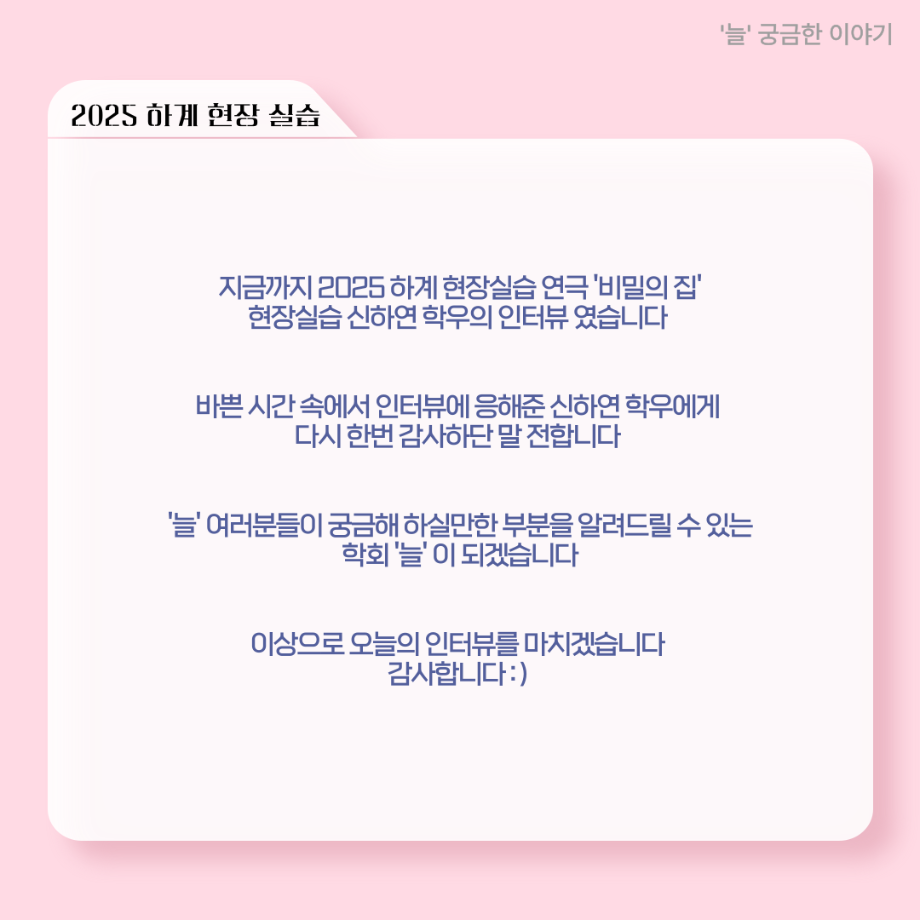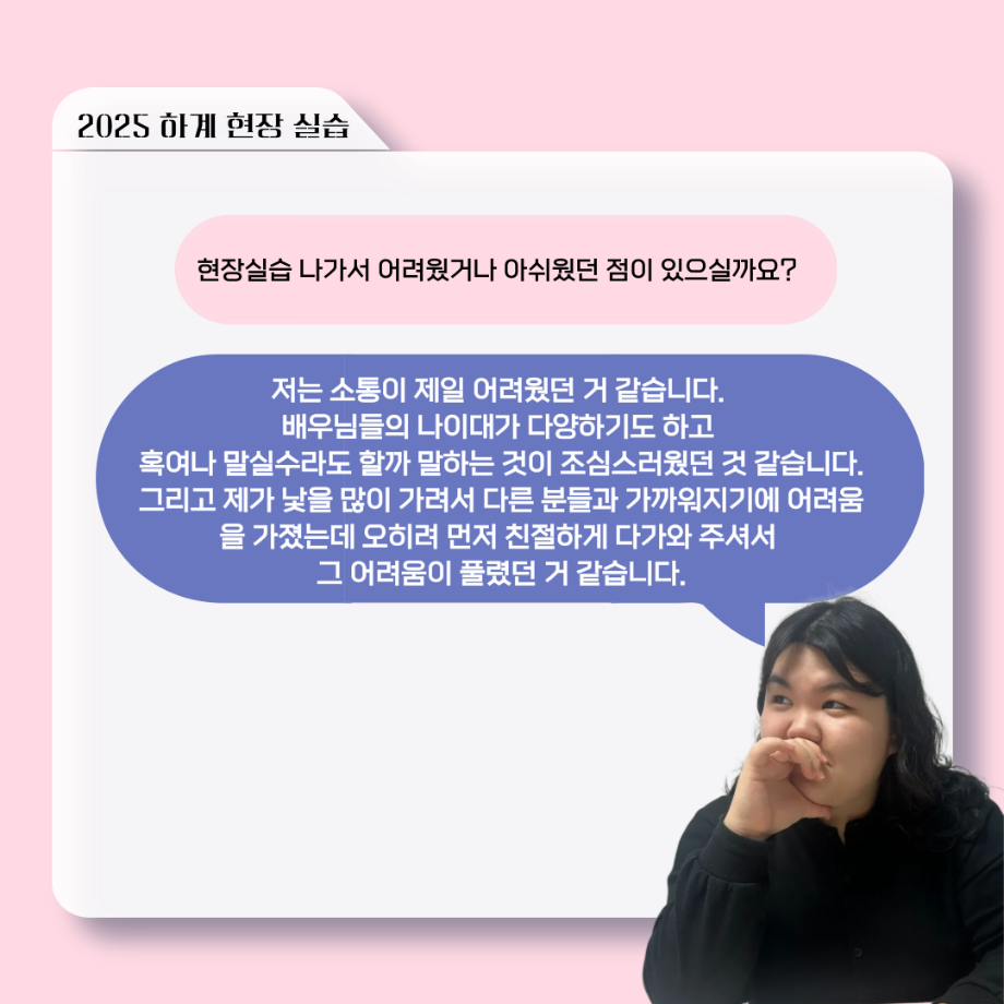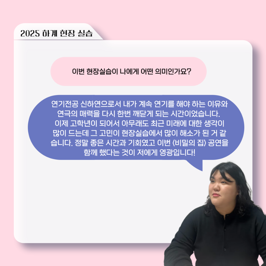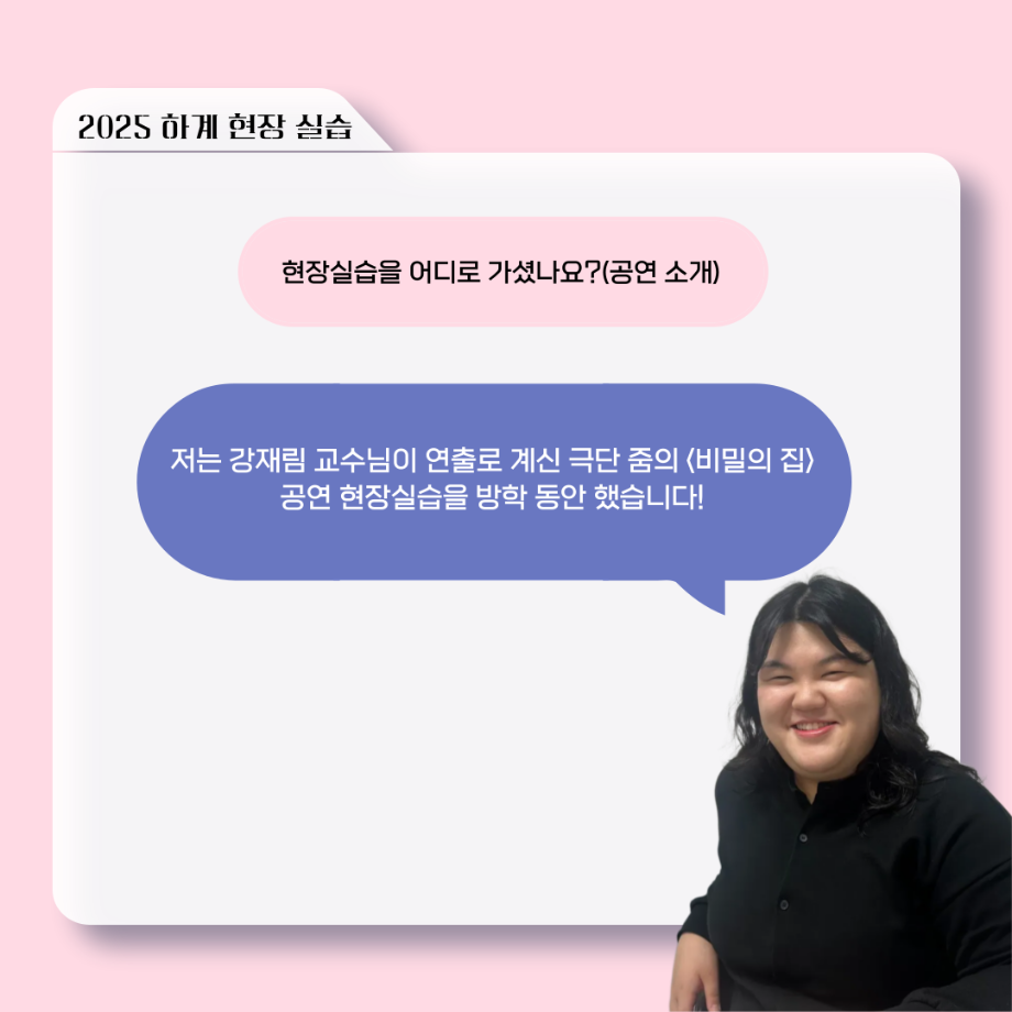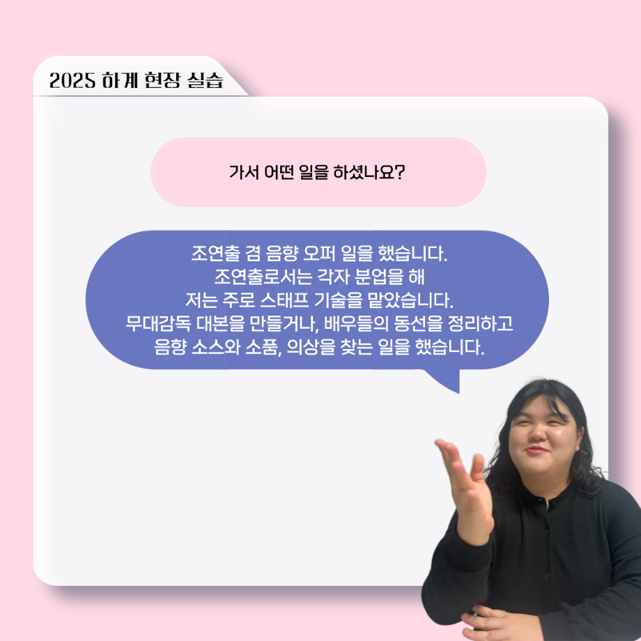 본문 시작 홈으로 커뮤니티 학과소개 입학정보 교수소개 학과과정 커뮤니티 공연예매 안내 홈페이지가이드 포토갤러리 공지사항 포토갤러리 작품DB 동아리 학사일정 학생회 포토갤러리 페이스북 트위터 프린트 ‘늘‘ 궁금한 이야기 - 현장실습 < 신하연 > 연기예술학과 1016 2025-10-16 . 목록 이전117회 세명대학교 연기예술학과 하계프로젝트 사랑의 온도 배우 소개 다음 ‘늘‘ 궁금한 이야기 - 하계 프로젝트 ‘컨택’팀 고진役 < 조진석 > 담당부서 : 연기예술학과 담당자 : - 연락처 : 043-649-1733 최종수정일 : 2024-10-26 만족도조사 만족도 조사 이 페이지에서 제공하는 정보에 대하여 만족하시나요? 매우만족 만족 보통 불만족 매우불만족