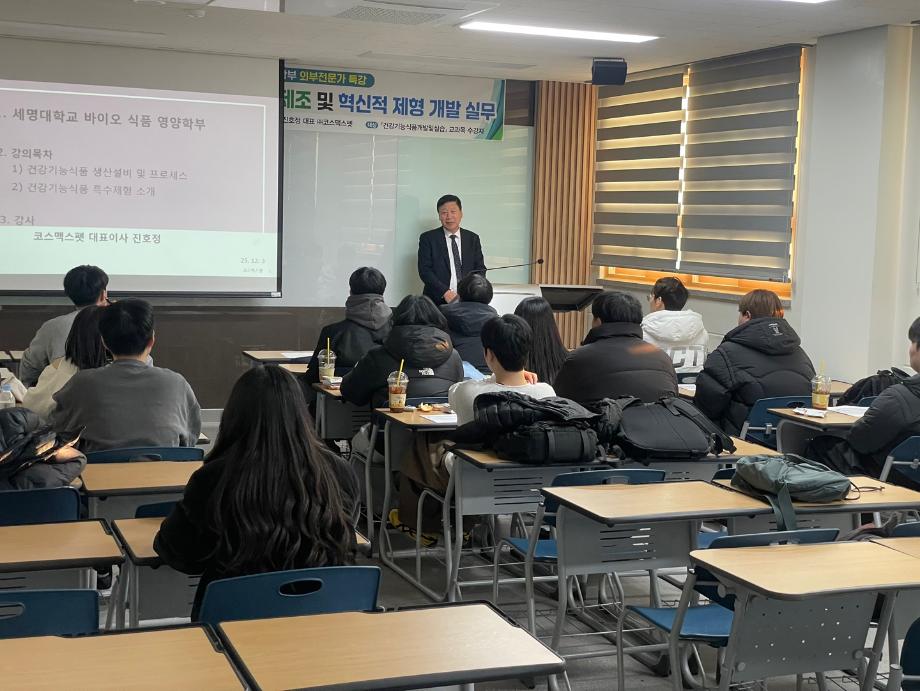 본문 시작 홈으로 커뮤니티 학부소개 진로·취업 교육과정 커뮤니티 대학원 입학상담 홈페이지가이드 갤러리 공지사항 갤러리 학생회 동문회 전공자료실 전공동아리 Youtube Instagram 갤러리 페이스북 트위터 프린트 실무체험 외부전문가 특강: 진호정 대표(코스맥스펫) 바이오식품영양학부 110 2025-12-04 실무체험교과목 "건강기능식품개발및실습" 특강 1) 강사: 진호정 대표(코스맥스펫) 2) 주제: '산업 현장에서의 건강기능식품 제조 및 혁신적 제형 개발 실무' 3) 일시 및 장소: 12월 3일, 바이오학관302호 *특강을 통해 현장 실무과 취업 및 연구동향에 대해 자세히 강의해 주신 진호정 대표님께 감사드립니다. 목록 이전2025 자기설계 해외배낭연수(7/8~7/15, 호주) 담당부서 : 바이오식품영양학부 담당자 : - 연락처 : 043-649-1578 최종수정일 : 2024-10-26 만족도조사 만족도 조사 이 페이지에서 제공하는 정보에 대하여 만족하시나요? 매우만족 만족 보통 불만족 매우불만족