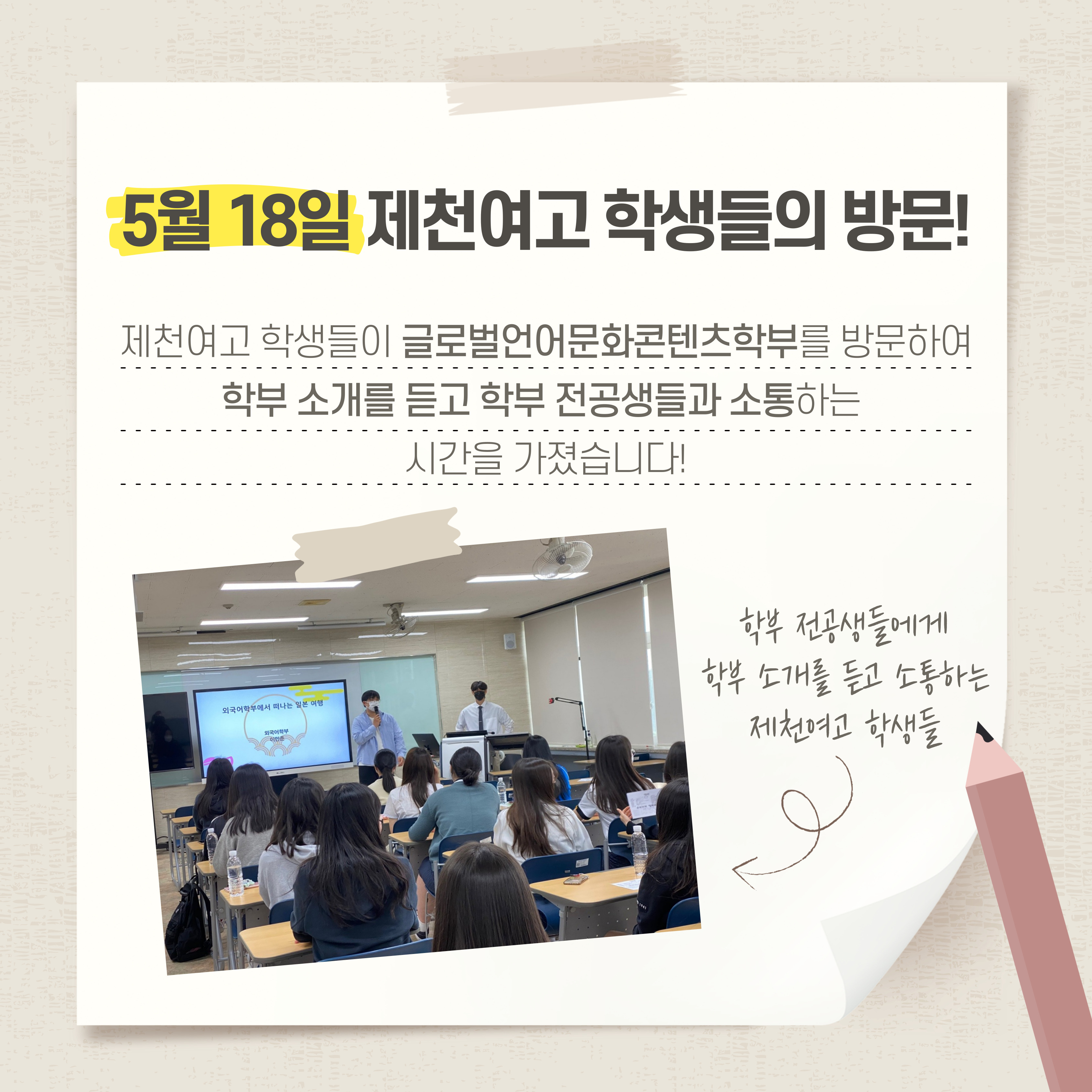 본문 시작 홈으로 YES! SMUFS 학부소개 교육과정 교육활동 입학&취업활동 YES! SMUFS 홈페이지가이드 SMUFS News 공지사항 SMUFS News SMUFS SNS SMUFS News 페이스북 트위터 프린트 글로벌언어문화콘텐츠학부 2022 제천여고(프리칼리지) 전공체험 조회 : 2888 등록일 : 2022-05-26 KakaoTalk_20220526_152550599.jpg ( 1,330 kb) ?atchFileId=FILE_000000000114001&fileSn=0 KakaoTalk_20220526_152550599.jpg 목록 이전글로벌언어문화콘텐츠학부 2022 성년의날 다음 글로벌언어문화콘텐츠학부 2022 스승의날