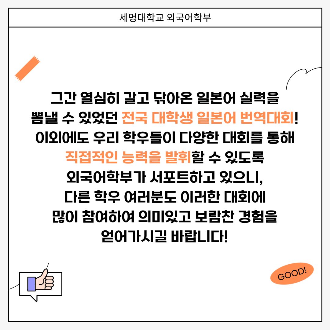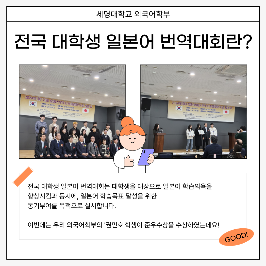 본문 시작 홈으로 YES! SMUFS 학부소개 교육과정 교육활동 입학&취업활동 YES! SMUFS 홈페이지가이드 SMUFS News 공지사항 SMUFS News SMUFS SNS SMUFS News 페이스북 트위터 프린트 2024 전국 대학생 일본어 번역대회 조회 : 2002 등록일 : 2024-12-24 001.png ( 497 kb) ?atchFileId=FILE_000000000218776&fileSn=0 001.png 목록 이전2024 학술제 다음 2024 콘텐츠스쿨 CGV