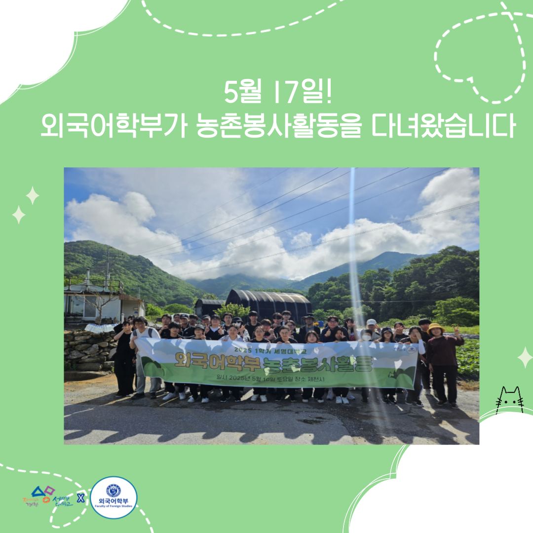 본문 시작 홈으로 YES! SMUFS 학부소개 교육과정 교육활동 입학&취업활동 YES! SMUFS 홈페이지가이드 SMUFS News 공지사항 SMUFS News SMUFS SNS SMUFS News 페이스북 트위터 프린트 2025 농촌봉사활동 조회 : 752 등록일 : 2025-05-29 1747795240272.png ( 199 kb) ?atchFileId=FILE_000000000224994&fileSn=0 1747795240272.png 목록 이전2025 스승의날 다음 2025 나만의 일본 홈스테이