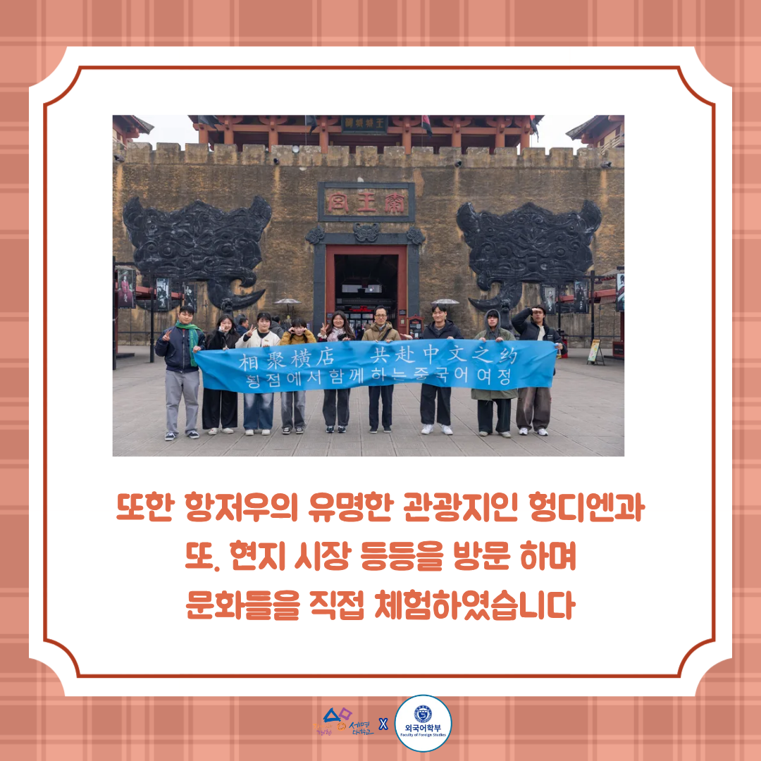 본문 시작 홈으로 YES! SMUFS 학부소개 교육과정 교육활동 입학&취업활동 YES! SMUFS 홈페이지가이드 SMUFS News 공지사항 SMUFS News SMUFS SNS SMUFS News 페이스북 트위터 프린트 2025 중국 어학연수 조회 : 414 등록일 : 2026-01-20 1.png ( 90 kb) ?atchFileId=FILE_000000000234803&fileSn=0 1.png 목록 이전2025 필리핀 어학연수 다음 2026 꿈설계학기