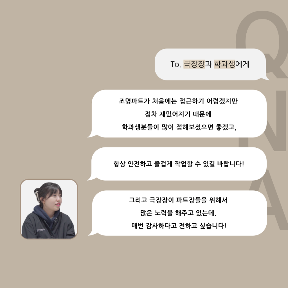 본문 시작 홈으로 커뮤니티 학과소개 입학정보 교수소개 학과과정 커뮤니티 공연예매 안내 홈페이지가이드 동아리 공지사항 포토갤러리 작품DB 동아리 학사일정 학생회 극장 스탭 동아리 무용 동아리 뮤지컬 동아리 극장 스탭 동아리 배우 훈련 동아리 극장 스탭 동아리 페이스북 트위터 프린트 ’품‘위있는 인’터뷰‘ - 24년도 조명장 <오승아> 연기예술학과 2441 2024-07-22 안녕하십니까. 24년도 학회 ‘품‘ 입니다. 학회 ‘품’의 다섯 번째 인터뷰로 세명대학교 연기예술학과 24학년도 조명장인 오승아 학우와 인터뷰 하는 시간을 가졌습니다. 조명장을 맡게된 소감과 조명은 어떤 의미가 있는지, 조명에서 조심히 해야하는 것은 무엇이며 극장장과 학과생에게 전하고 싶은 말 등을 질문하는 시간을 가졌습니다. 앞으로 있을 인터뷰 컨텐츠인 ‘품터뷰’ 많은 사랑 부탁드립니다. 목록 이전’품‘위있는 인’터뷰‘ - 24년도 무대장 <장보배> 다음 ’품‘위있는 인’터뷰‘ - 24년도 음향장 <임소정> 만족도조사 만족도 조사 이 페이지에서 제공하는 정보에 대하여 만족하시나요? 매우만족 만족 보통 불만족 매우불만족