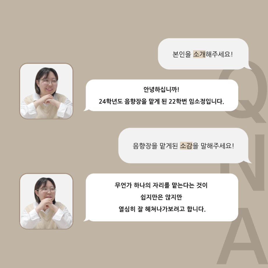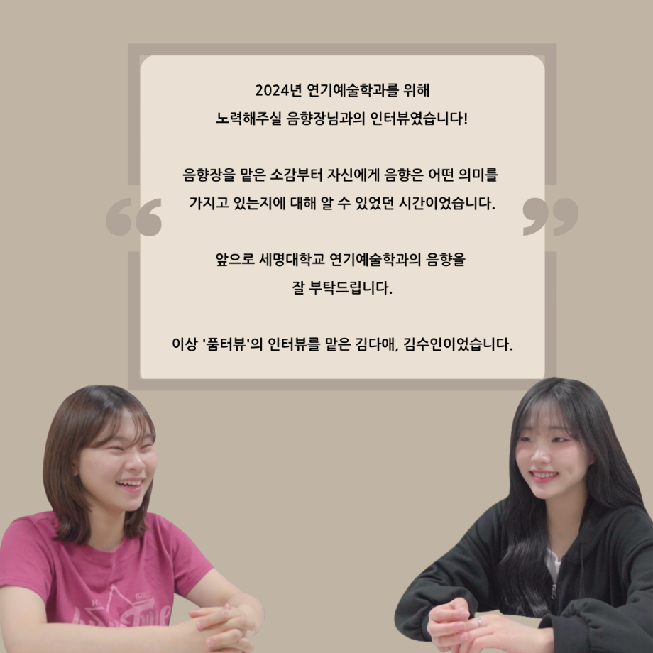 본문 시작 홈으로 커뮤니티 학과소개 입학정보 교수소개 학과과정 커뮤니티 공연예매 안내 홈페이지가이드 동아리 공지사항 포토갤러리 작품DB 동아리 학사일정 학생회 극장 스탭 동아리 무용 동아리 뮤지컬 동아리 극장 스탭 동아리 배우 훈련 동아리 극장 스탭 동아리 페이스북 트위터 프린트 ’품‘위있는 인’터뷰‘ - 24년도 음향장 <임소정> 연기예술학과 2480 2024-07-24 안녕하십니까. 24년도 학회 ‘품‘ 입니다. 학회 ‘품’의 여섯 번째 인터뷰로 세명대학교 연기예술학과 24학년도 음향장인 임소정 학우와 인터뷰 하는 시간을 가졌습니다. 음향장을 맡게된 소감과 음향은 어떤 의미가 있는지, 음향에서 조심히 해야하는 것은 무엇이며 극장장과 학과생에게 전하고 싶은 말 등을 질문하는 시간을 가졌습니다. 앞으로 있을 인터뷰 컨텐츠인 ‘품터뷰’ 많은 사랑 부탁드립니다. 목록 이전’품‘위있는 인’터뷰‘ - 24년도 조명장 <오승아> 다음 세명대학교 연기예술학과 극장동아리 ‘짜스트’ 만족도조사 만족도 조사 이 페이지에서 제공하는 정보에 대하여 만족하시나요? 매우만족 만족 보통 불만족 매우불만족