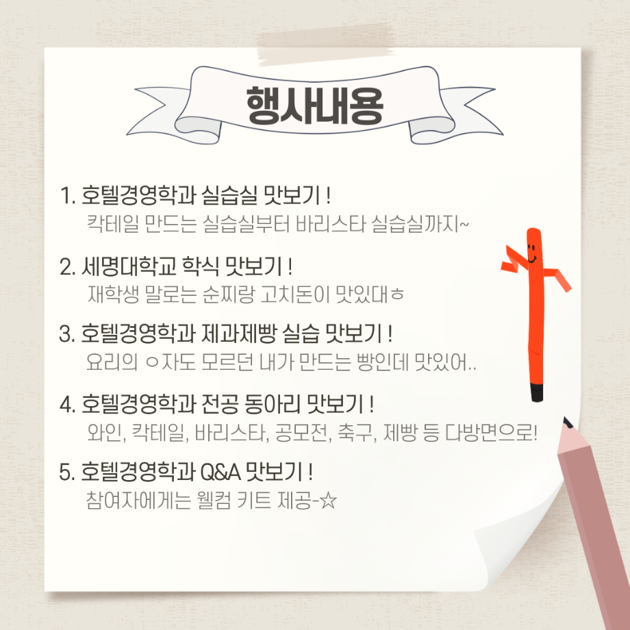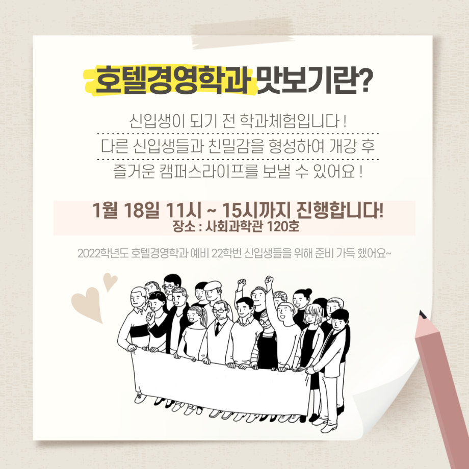 본문 시작 홈으로 학과소개 커뮤니티 학과소개 교육 홈페이지가이드 학과행사 학과장인사말 교수소개 학과행사 학과행사 페이스북 트위터 프린트 2022년 호텔경영학과 지원 수험생 대상 맛보기 행사 호텔경영학과 2002 2022-01-18 2022학년도 호텔경영학과 맛보기 행사 1. 행사 일정 : 2022년 1월 18일(화)_사회과학관 120호 2. 행사 시간 : 오전 11시 ~ 오후 3시 3. 행사 대상 : 2022학년도 호텔경영학과 예비 22학번 4. 행사 내용 - 호텔경영학과 실습실 맛보기 ! - 세명대학교 학식 맛보기 ! - 호텔경영학과 제과제빵 실습 맛보기 ! - 호텔경영학과 전공 동아리 맛보기 ! - 호텔경영학과 Q&A 맛보기 ! * 참여자에게 웰컴키트 제공 ! 목록 다음 2021년 재학생 행사 만족도조사 만족도 조사 이 페이지에서 제공하는 정보에 대하여 만족하시나요? 매우만족 만족 보통 불만족 매우불만족