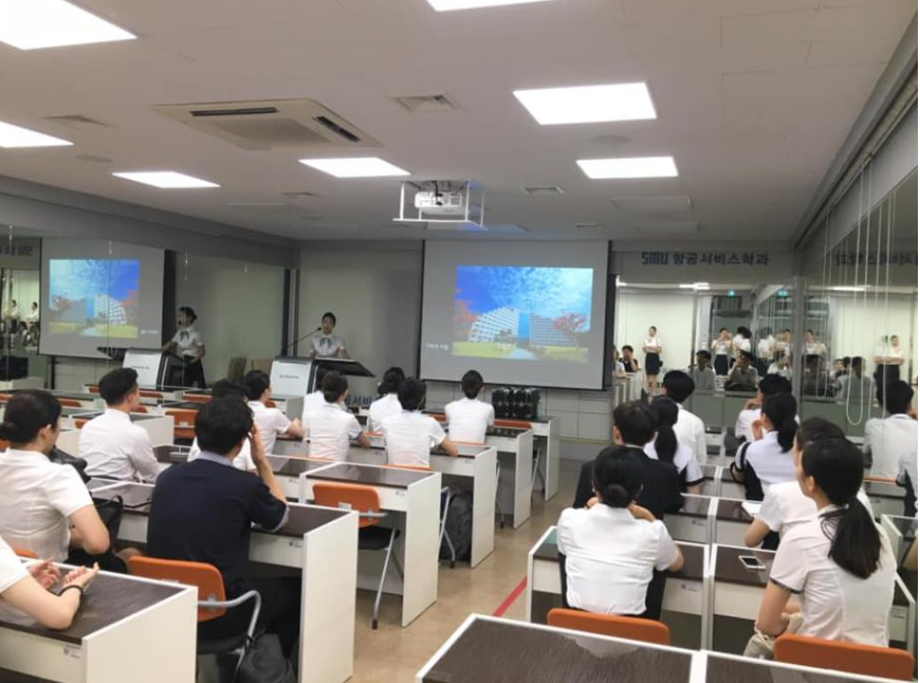 1부는 사회과학관에서 조별로 예선모의면접, 식음료서비스실습과 승객안전브리핑, 헤어두와 메이크업, 워킹과 인사연습 등 실제 재학생들이 듣는 수업을 입시생분들에게 보여드리고 참여해볼 수 있는 프로그램을 진행하였습니다