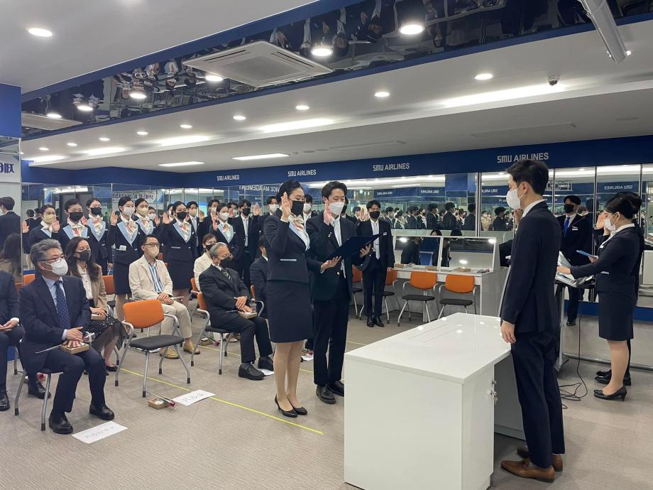 행사는 학과장님 인사, 총장님 축사를 통해 미래의 항공 승무원으로서 첫 발을 내디딘 학생들을 격려하는 시간을 가졌으며 이어서 학생대표의 선서가 진행되었습니다 🛫