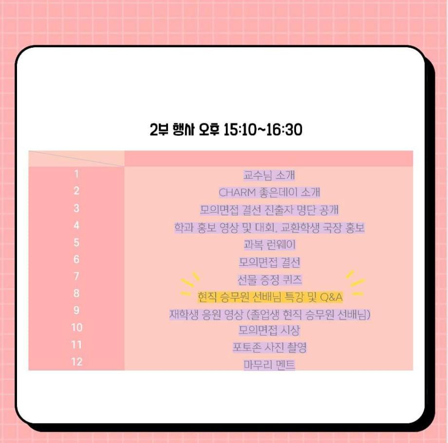 CHARM 좋은데이 행사의 자세한 일정과 관련 공지사항을 카드뉴스로 간단하게 정리해보았으니 지원자분들께서는 참고해주시길 바랍니다 🔍