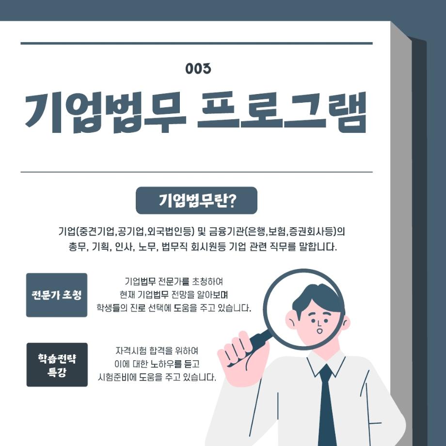 본문 시작 홈으로 학과과정 학과안내 교수소개 학과과정 커뮤니티 홈페이지가이드 비교과프로그램 교육과정 전공교육 체계도 대학원 법학과 비교과프로그램 학사일정 기업법무 지원프로그램 공공법무 지원프로그램 기업법무 지원프로그램 기업법무 지원프로그램 페이스북 트위터 프린트 비교과 프로그램 알아보기 '기업법무' 법학과 415 2025-09-04 목록 이전기업법무 지원프로그램이란??? 이전2025.05.21 항공운송법 관련 특강 담당부서 : 법학과 담당자 : - 연락처 : 043-649-1764 최종수정일 : 2024-10-26 만족도조사 만족도 조사 이 페이지에서 제공하는 정보에 대하여 만족하시나요? 매우만족 만족 보통 불만족 매우불만족