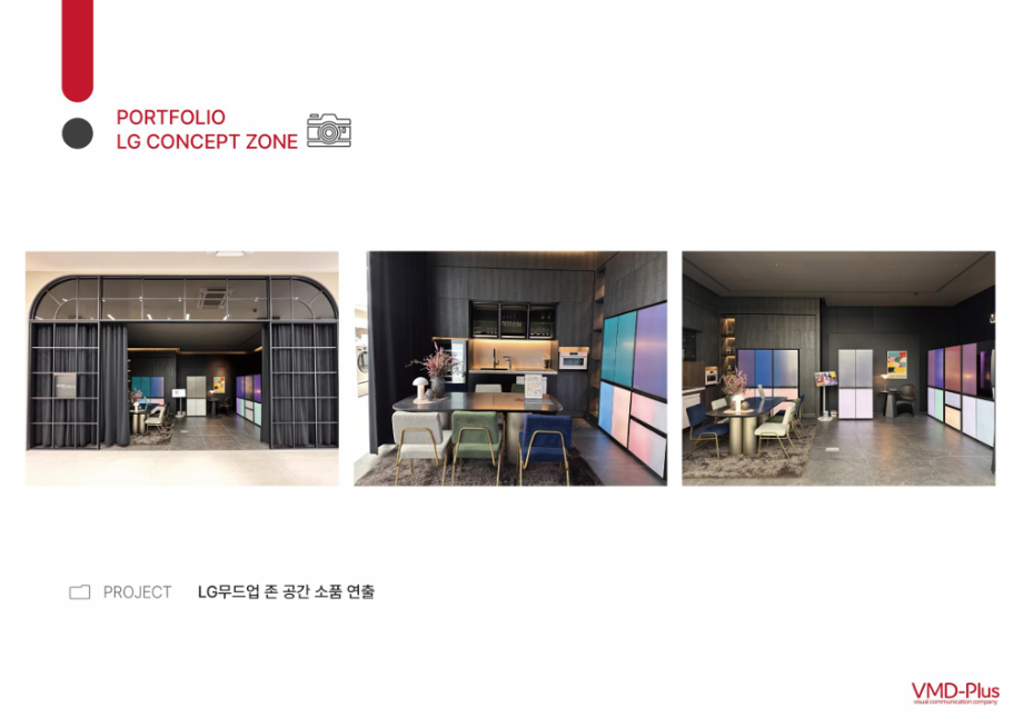 브이엠디플러스는 LG전자 가전매장 연출을 담당하였던 VMD(visual merchandiser) 조직 구성원을 주축으로 국내 유일의 전자 관련 VMD 회사로 매장 연출 기획과 현장 실행을 주도하는 회사힙니다. LG전자의 도급사로서 판매 목적을 효율적으로 달성할 수 있도록 특정 상품이나 서비스를 시각적으로 연출하고 관리합니다.