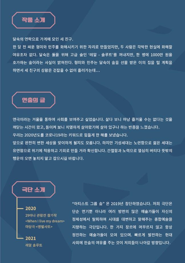 본문 시작 홈으로 학과소개 학과소개 입학정보 교수소개 학과과정 커뮤니티 공연예매 안내 홈페이지가이드 진로 학과개요 학과장인사말 학과연혁 세명대학교 민송아트홀 학과행사 진로 진로 페이스북 트위터 프린트 - 졸업생 창단 극단 ‘아티스트 그룹 숨’ 정기 공연 안내 연기예술학과 2200 2021-04-06 “일어나라, 자본주의의 반항아들아.” 🎓 졸업생 12학번 오기택 선배님이 창단한 [아티스트 그룹 숨] 두 번째 정기 공연작 <레알 솔루트> 🎓 일시 : 2021. 04. 06 (화) - 2021. 04. 18 (일) 목록 다음 졸업생 이현석 배우 국립극단 <무중력 연애 : 낭독 공연> 다음 졸업생 장하다, 극단 늘품의 ‘ 후설’ 무대 특별상 수상 만족도조사 만족도 조사 이 페이지에서 제공하는 정보에 대하여 만족하시나요? 매우만족 만족 보통 불만족 매우불만족