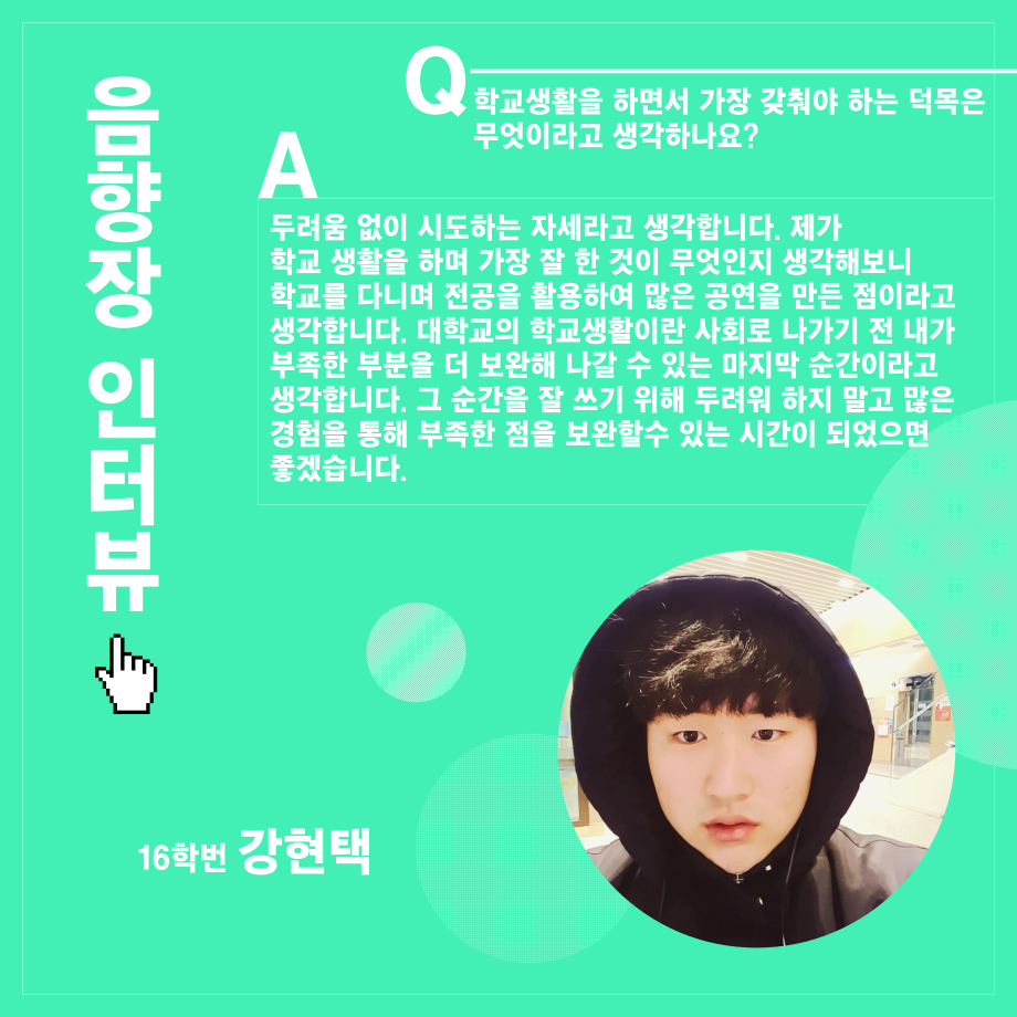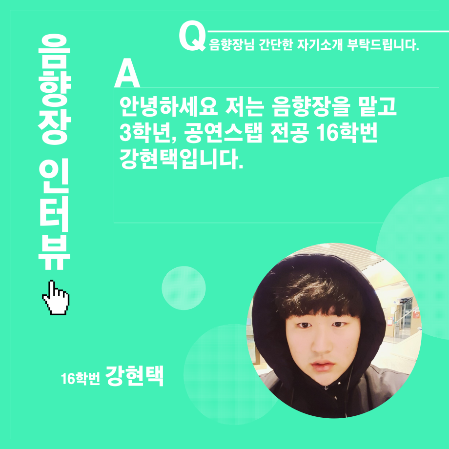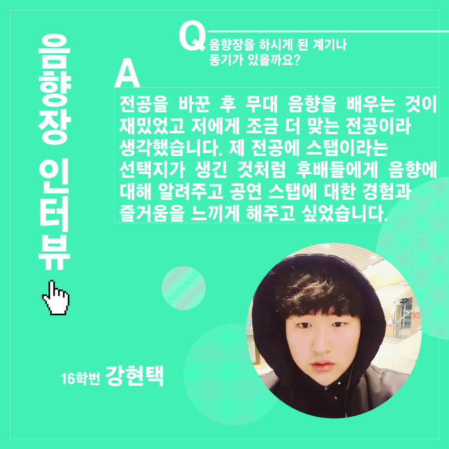 본문 시작 홈으로 학과소개 학과소개 입학정보 교수소개 학과과정 커뮤니티 공연예매 안내 홈페이지가이드 진로 학과개요 학과장인사말 학과연혁 세명대학교 민송아트홀 학과행사 진로 진로 페이스북 트위터 프린트 연기예술학과 음향장 인터뷰 연기예술학과 2578 2021-12-17 목록 이전연기예술학과 조명장 인터뷰 다음 연기예술학과 극장장 인터뷰 만족도조사 만족도 조사 이 페이지에서 제공하는 정보에 대하여 만족하시나요? 매우만족 만족 보통 불만족 매우불만족