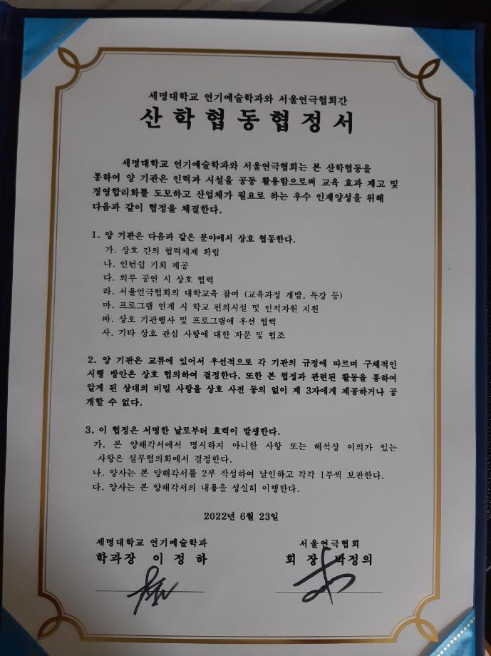 본문 시작 홈으로 학과과정 학과소개 입학정보 교수소개 학과과정 커뮤니티 공연예매 안내 홈페이지가이드 MOU 체결 교육과정 전공교육 체계도 비교과프로그램 MOU 체결 MOU 체결 페이스북 트위터 프린트 세명대학교 연기예술학과 서울연극협회 산학 협동 협정서 연기예술학과 3016 2022-07-12 목록 이전세명대학교 (전방송연예학과와) (현 연기예술학과) 극단 이유 산학 협동 협정서 다음 세명대학교 연기예술학과, 극단 명작옥수수밭과 산학협력협약(MOU) 체결 만족도조사 만족도 조사 이 페이지에서 제공하는 정보에 대하여 만족하시나요? 매우만족 만족 보통 불만족 매우불만족