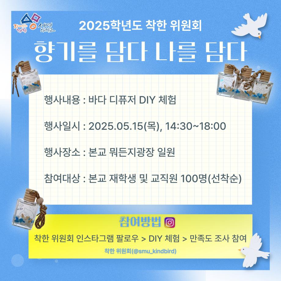 본문 시작 홈으로 공지사항 학생위원회 개요 학생위원회 소개 공지사항 활동결과 홈페이지가이드 프로그램 계획 프로그램 계획 세명대학교 공지사항 프로그램 계획 페이스북 트위터 프린트 [착한 위원회] 향기를 담다 나를 담다 학생처 638 2025-05-15 [착한 위원회] 향기를 담다 나를 담다 1. 행사일시 ■ 2025년 5월 15일(목), 14시 30분~18시 2. 행사장소 ■ 본교 뭐든지광장 3. 행사내용 ■ 바다 디퓨저 DIY 체험 및 착한 위원회 활동 만족도 조사 4. 참여대상 ■ 본교 재학생 및 교직원 100명(선착순) 목록 이전[꽃피는 위원회] 향기로운 청룡의 하루(시나몬스틱 방향제 만들기) 다음 [착한 위원회] 포근한 한 송이 담당부서 : 장학복지팀 담당자 : - 연락처 : 043-649-1142 최종수정일 : 2024-10-26 만족도조사 만족도 조사 이 페이지에서 제공하는 정보에 대하여 만족하시나요? 매우만족 만족 보통 불만족 매우불만족