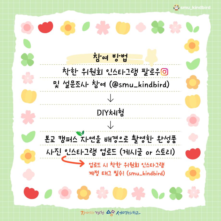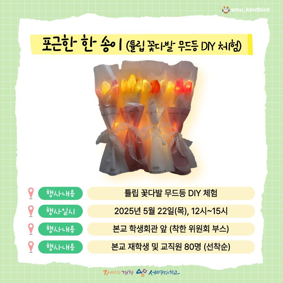 본문 시작 홈으로 공지사항 학생위원회 개요 학생위원회 소개 공지사항 활동결과 홈페이지가이드 프로그램 계획 프로그램 계획 세명대학교 공지사항 프로그램 계획 페이스북 트위터 프린트 [착한 위원회] 포근한 한 송이 학생처 867 2025-05-22 1. 행사일시 ■ 2025년 5월 22일(목), 12시~15시 2. 행사장소 ■ 본교 학생회관 앞 3. 행사내용 ■ 튤립 꽃다발 무드등 DIY 체험 및 착한 위원회 관련 설문조사 4. 참여대상 ■ 본교 재학생 및 교직원 80명(선착순) 목록 이전[착한 위원회] 향기를 담다 나를 담다 다음 [꽃피는 위원회] 제4회 사랑의 꽃집사 이벤트 담당부서 : 장학복지팀 담당자 : - 연락처 : 043-649-1142 최종수정일 : 2024-10-26 만족도조사 만족도 조사 이 페이지에서 제공하는 정보에 대하여 만족하시나요? 매우만족 만족 보통 불만족 매우불만족