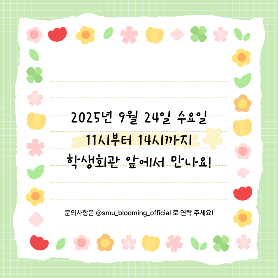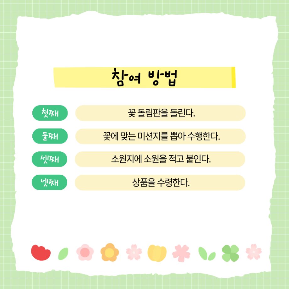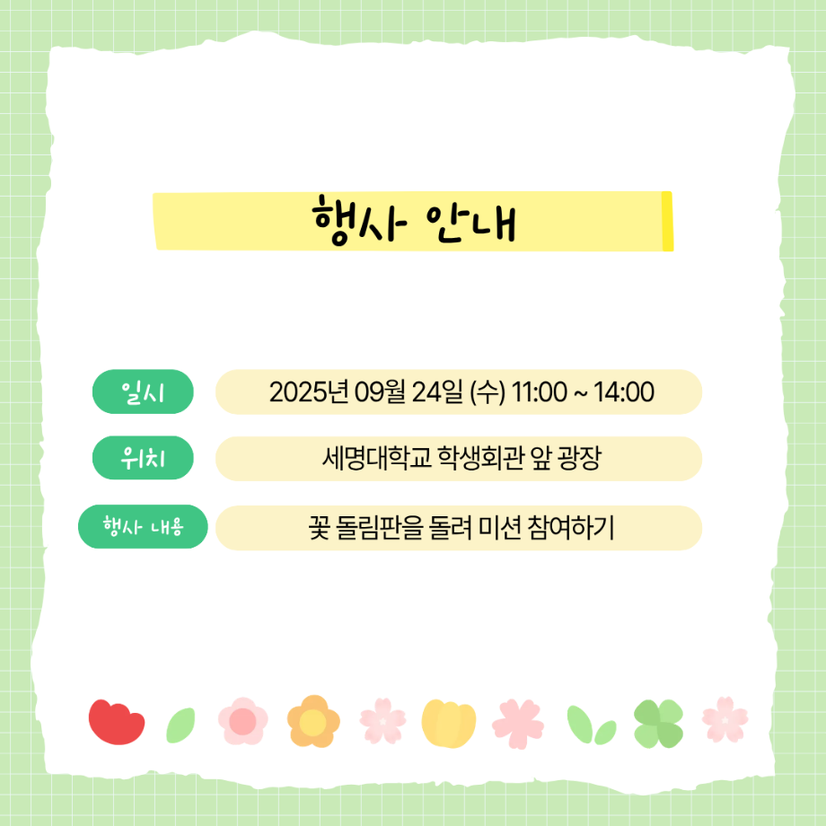본문 시작 홈으로 공지사항 학생위원회 개요 학생위원회 소개 공지사항 활동결과 홈페이지가이드 프로그램 계획 프로그램 계획 세명대학교 공지사항 프로그램 계획 페이스북 트위터 프린트 [꽃피는 위원회] 꽃 돌려라 피어라! 학생처 148 2025-09-24 < 꽃피는 위원회 청룡체전기간 행사 안내 > 1. 행사명: 꽃 돌려라 피어라 2. 일시: 2025.9..24(수) 11:00~14:00 3. 장소: 학생회관 앞 광장 학생위원회 부스 4. 참여방법 - 꽃 돌림판을 돌린다 - 나온 꽃에 맞는 미션지를 뽑아 수행한다 - 소원지에 소원을 붙인다 - 상품을 수령한다 5. 상품: 이온음료 등 소소한 미션도 즐기고 소원도 남기며 즐거운 시간을 보내세요 학우 여러분의 많은 관심과 참여 부탁드립니다. 목록 이전[학생위원회] 청룡체전기간 학생위원회 전체활동안내 다음 [용감한 창업자] 어떤 향이 좋아? 담당부서 : 장학복지팀 담당자 : - 연락처 : 043-649-1142 최종수정일 : 2024-10-26 만족도조사 만족도 조사 이 페이지에서 제공하는 정보에 대하여 만족하시나요? 매우만족 만족 보통 불만족 매우불만족