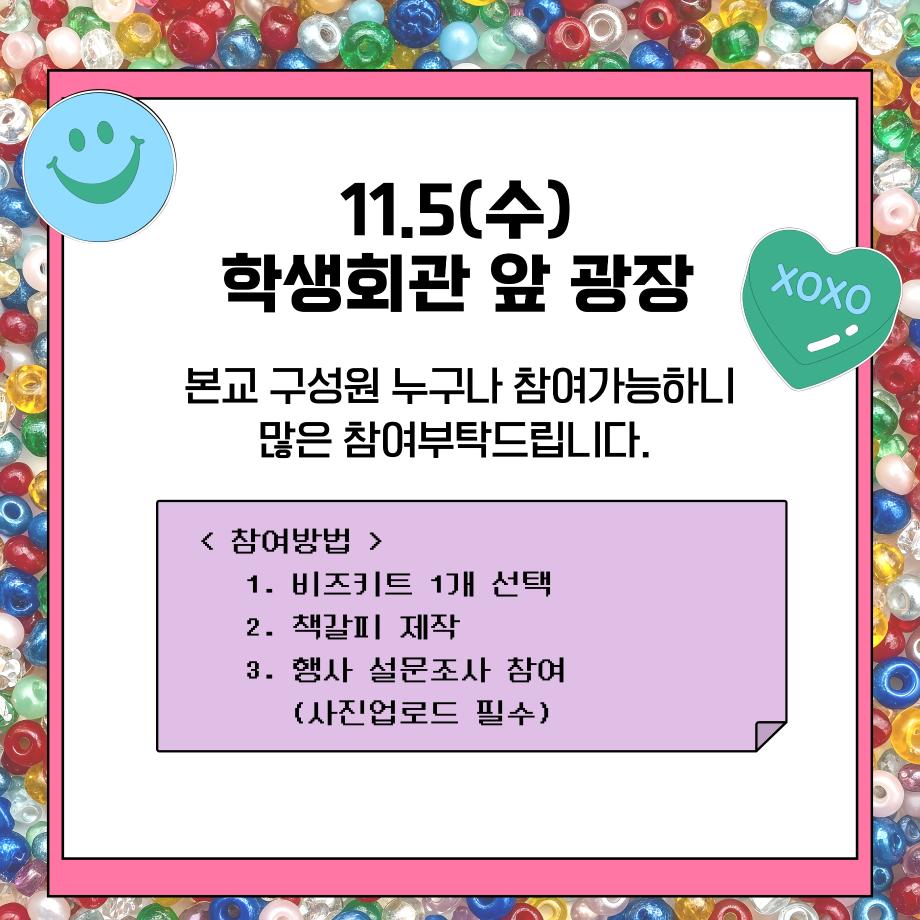 본문 시작 홈으로 공지사항 학생위원회 개요 학생위원회 소개 공지사항 활동결과 홈페이지가이드 프로그램 계획 프로그램 계획 세명대학교 공지사항 프로그램 계획 페이스북 트위터 프린트 [꽃피는 위원회] 북!마크!해버렸지뭐야 학생처 103 2025-11-05 꽃피는 위원회의 <비즈 책갈피 만들기> 행사명: 북!마크!해버렸지뭐야 행사일: 2025.11.05(수) 12시~15시 장 소: 학생회관 앞 광장 참여대상: 본교 구성원 선착순 100명 한정 많은 참여 부탁드립니다. 목록 이전[착한 위원회] 약과하나 주면 안잡아 먹지 다음 [맛있는 위원회] 얼죽아 모임에 초대합니다 담당부서 : 장학복지팀 담당자 : - 연락처 : 043-649-1142 최종수정일 : 2024-10-26 만족도조사 만족도 조사 이 페이지에서 제공하는 정보에 대하여 만족하시나요? 매우만족 만족 보통 불만족 매우불만족