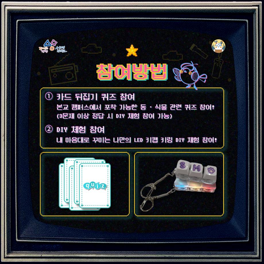 본문 시작 홈으로 공지사항 학생위원회 개요 학생위원회 소개 공지사항 활동결과 홈페이지가이드 프로그램 계획 프로그램 계획 세명대학교 공지사항 프로그램 계획 페이스북 트위터 프린트 [착한 위원회] 나만의 키 입력 중 학생처 174 2025-11-05 [착한 위원회] 나만의 키 입력 중 1. 행사일시 ■ 2025년 11월 05일(수), 12시~15시 2. 행사장소 ■ 본교 학생회관 앞 3. 행사내용 ■ 본교 캠퍼스에서 포착 가능한 동, 식물 관련 퀴즈 및 LED 키캡 키링 DIY 체험 4. 참여대상 ■ 본교 재학생 및 교직원 100명(선착순) 목록 이전[용감한 위원회] 창업? 다 이루어질지니~ 다음 [생각하는 위원회/ 약속하는 위원회] 세명파티시에 담당부서 : 장학복지팀 담당자 : - 연락처 : 043-649-1142 최종수정일 : 2024-10-26 만족도조사 만족도 조사 이 페이지에서 제공하는 정보에 대하여 만족하시나요? 매우만족 만족 보통 불만족 매우불만족