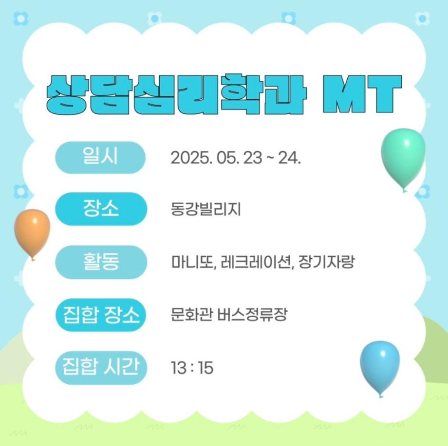 본문 시작 홈으로 학과 커뮤니티 학부소개 교수소개 교육목표 입학안내 학과 커뮤니티 대학원 커뮤니티 홈페이지가이드 학과 갤러리 학과소식 학사일정 학과 갤러리 학과 갤러리 페이스북 트위터 프린트 상담심리학과 MT 일정 안내 상담심리학과 608 2025-05-22 안녕하세요 상담심리학과 학생회 오비르입니다 ! 2025년 상담심리학과 MT 일정에 대해 안내드립니다 ~ 일시: 2025. 5. 23. (금) ~ 24. (토) 장소: 동강빌리지 (강원 영월군 영월읍 동강로 225) 집합 장소: 세명대학교 문화관 집합 시간: 13시 15분 집합 시간에 맞춰 모두 늦지 않게 와주시길 바랍니다. 상담심리학과의 첫 MT인 만큼 사고 없이 안전하고 즐겁게 다녀왔으면 좋겠습니다 ღゝ◡╹)ノ♡ 목록 이전음악이 심리에 미치는 영향 다음 2025 상담심리학과 MT 만족도조사 만족도 조사 이 페이지에서 제공하는 정보에 대하여 만족하시나요? 매우만족 만족 보통 불만족 매우불만족