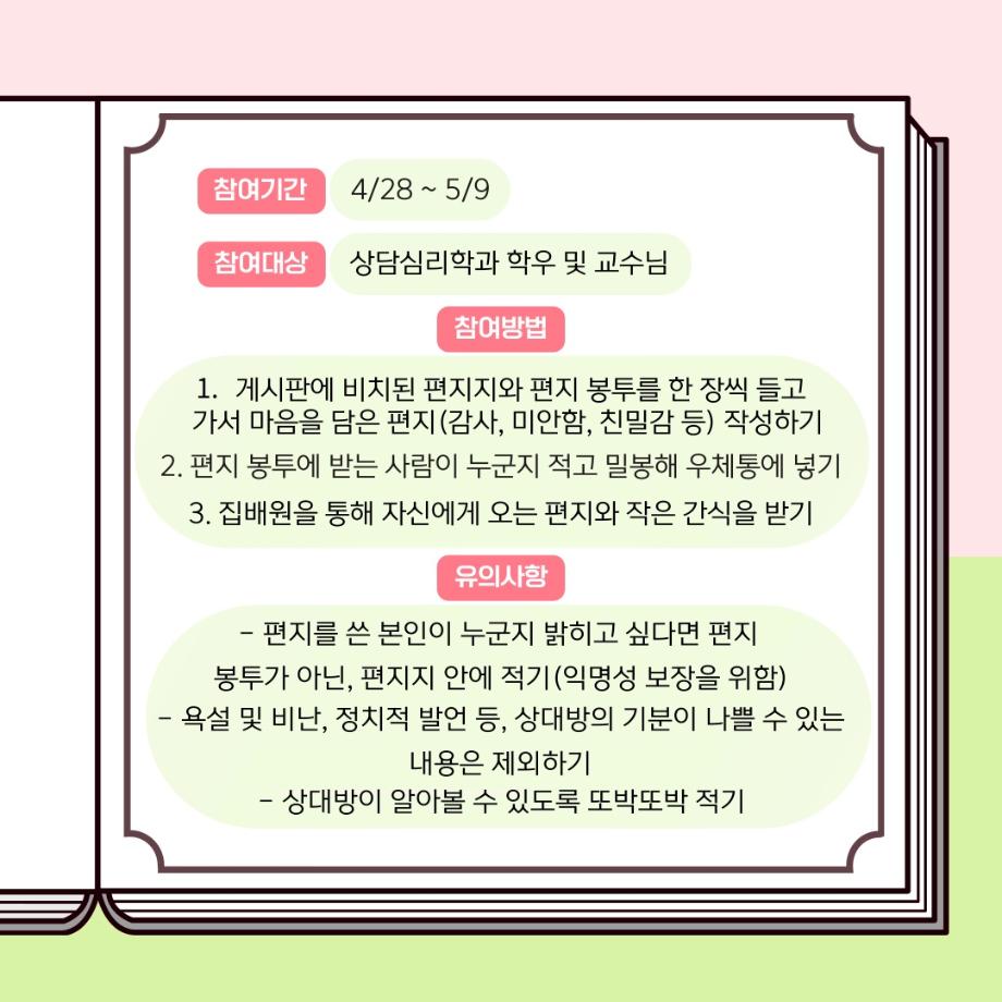 본문 시작 홈으로 학과 커뮤니티 학부소개 교수소개 교육목표 입학안내 학과 커뮤니티 대학원 커뮤니티 홈페이지가이드 학과 갤러리 학과소식 학사일정 학과 갤러리 학과 갤러리 페이스북 트위터 프린트 상담심리학과 표현데이 이벤트 상담심리학과 323 2025-04-29 안녕하세요 세명대학교 상담심리학과입니다! 여러분은 평소 고마웠던 마음이나 미안했던 감정을 전하고 싶었지만 말로 표현하기 어려웠던 순간이 있나요? 학과 동아리 GRIT에서 여러분의 따뜻한 마음을 전할 수 있도록 작은 이벤트를 준비했습니다! 참여기간: 4/28 ~ 5/9 참여대상: 상담심리학과 학우 및 교수님 짧은 한 마디로도 진심을 전할 수 있습니다! 많은 관심 부탁드립니다 :) 목록 다음 2025 상담심리학과 MT 다음 상담심리학과 표현데이 활동 소감 만족도조사 만족도 조사 이 페이지에서 제공하는 정보에 대하여 만족하시나요? 매우만족 만족 보통 불만족 매우불만족
