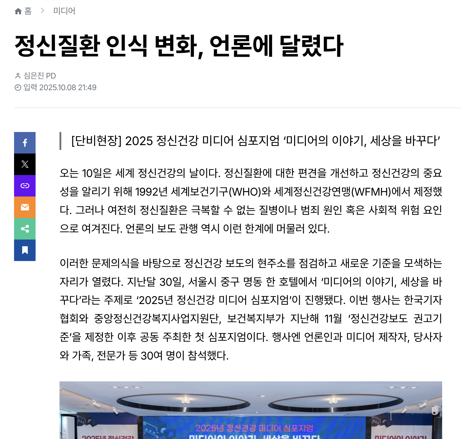 지난달 30일, 서울시 중구 명동 한 호텔에서 ‘미디어의 이야기, 세상을 바꾸다’라는 주제로 ‘2025년 정신건강 미디어 심포지엄’이 진행됐다.