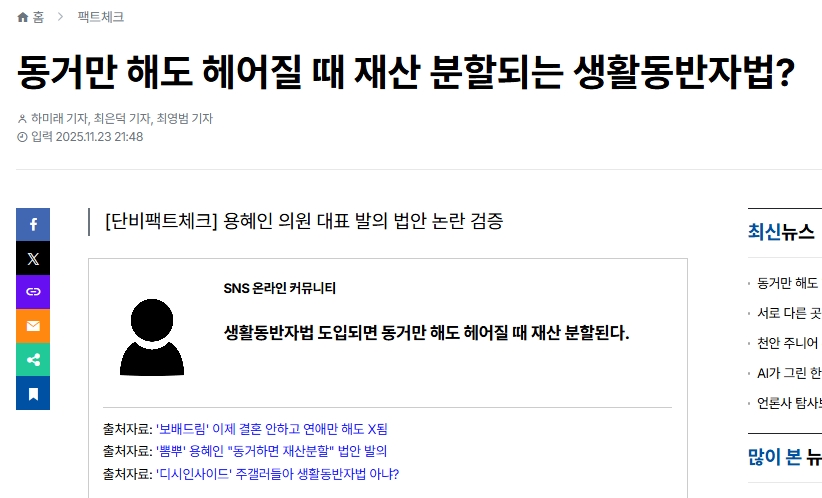SNS와 온라인 커뮤니티에서는 생활동반자법이 제정되면 “동거해도 헤어질 때 재산 분할이 된다”는 주장이 확산되고 있다.