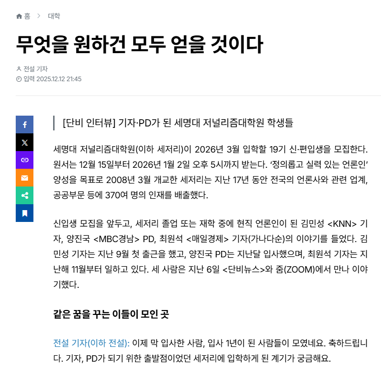 신입생 모집을 앞두고, 세저리 졸업 또는 재학 중에 현직 언론인이 된 김민성