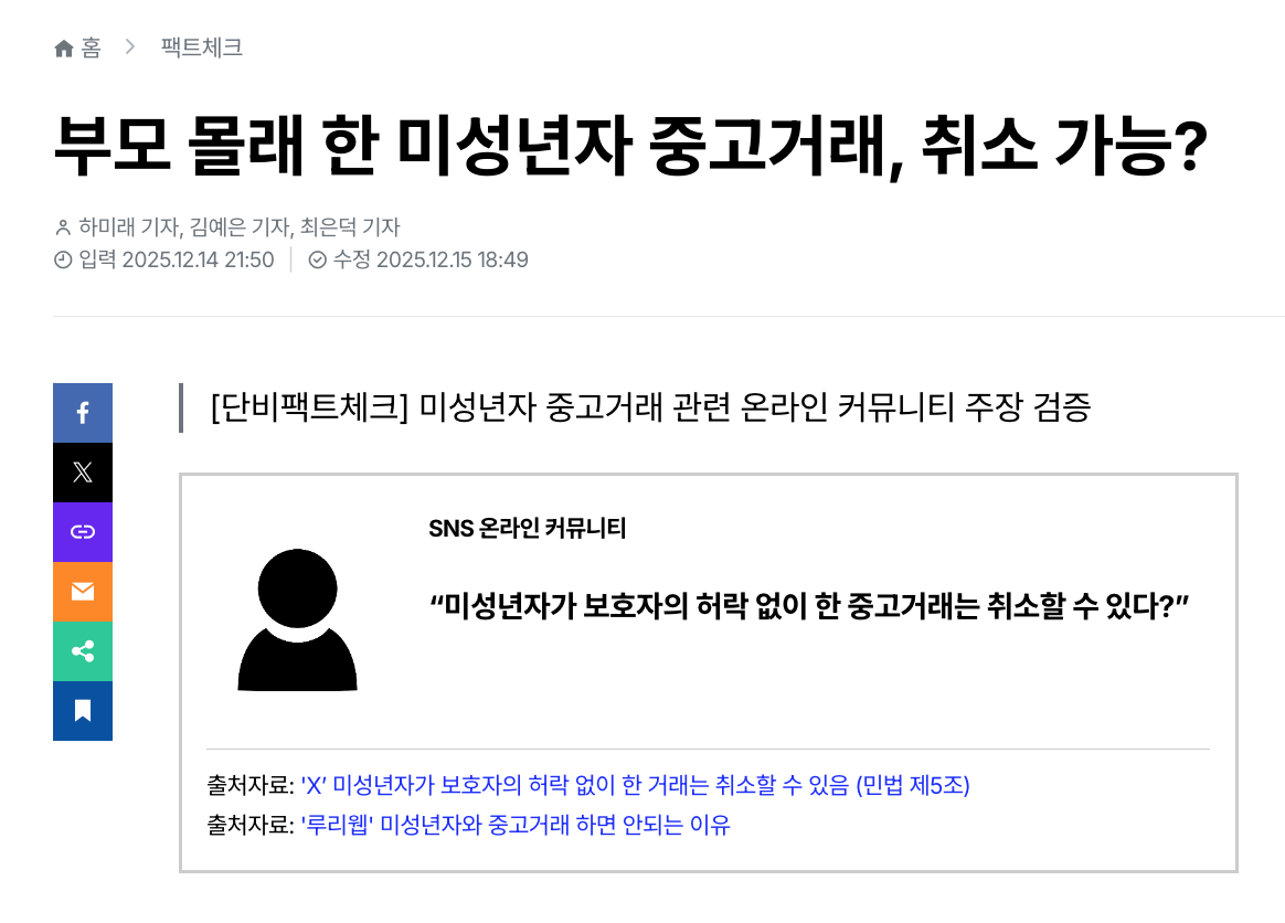 이에 한 누리꾼이 “미성년자가 보호자 동의 없이 한 거래는 취소할 수 있다”고 인용 게시글을 올렸고, 해당 글은 14일 기준 조회수 135만을 기록했다.