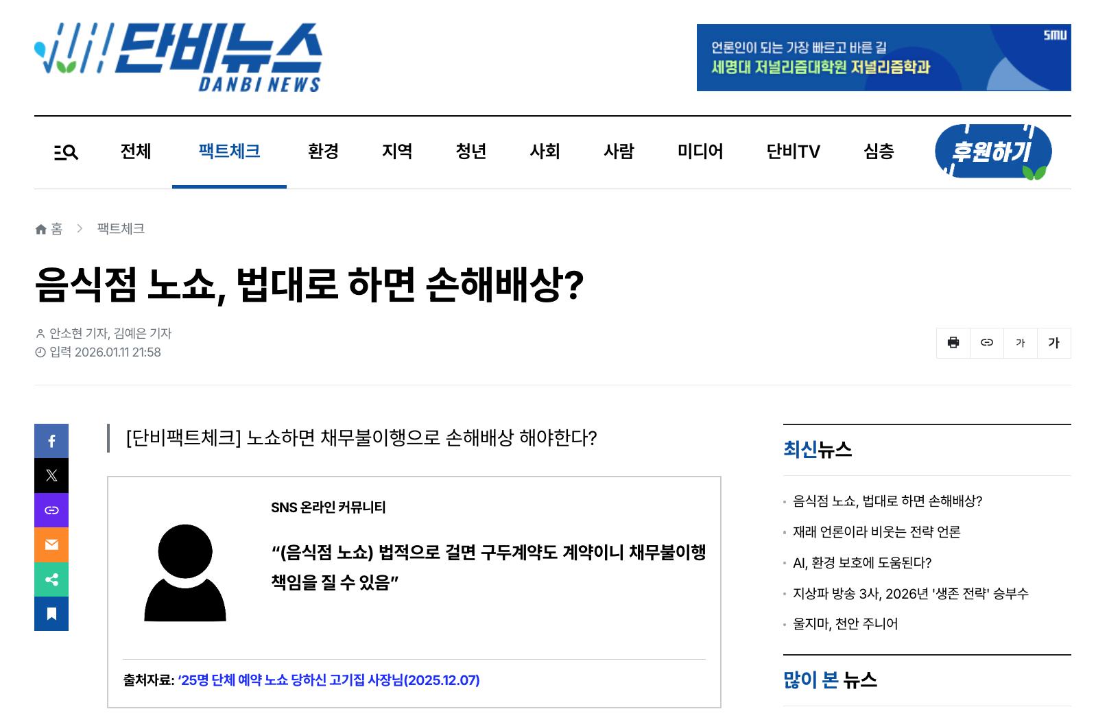 2025년 12월 7일, 한 온라인 커뮤니티에 ‘25명 단체 예약 노쇼 당하신 고깃집 사장님’이라는 제목의 게시글이 올라왔다. 한 고깃집 사장이 유선전화로 25명의 예약을 받았지만 약속 시간이 지나도 손님은 오지 않았다는 내용이었다, 40분을 기다렸다는 사장은 손님에게 연락했고, 이에 손님은 5분 뒤 도착이라고 답변했다. 그러나 손님은 전화를 다시 걸어 업장을 잘못 알고 예약했다고 말했다. 사장이 손님에게 노쇼이니 배상을 해야한다고 하자, 손님은 본인이 방문 전 전화를 주었으니 노쇼가 아니라고 주장했다는 것이다. 해당 게시글에는 ‘법적으로 걸면 구두계약도 계약이니 채무불이행 책임을 질 수 있음. 이미 고기 같은 거 다 준비해놔서 실질적으로 피해가 있으니까’ 라는 내용의 댓글이 달렸다. 이에 대해 게시글의 댓글처럼 소비자가 음식점에 예약을 하고도 방문하지 않았을 경우, 업주는 손님에게 채무불이행을 이유로 법적인 조치를 취할 수 있는지 검증해보고자 한다.