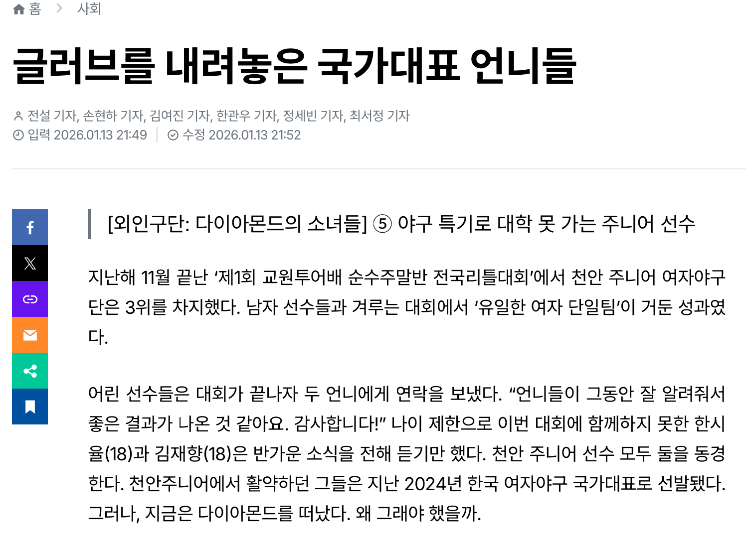 어린 선수들은 대회가 끝나자 두 언니에게 연락을 보냈다. “언니들이 그동안 잘 알려줘서 좋은 결과가 나온 것 같아요. 감사합니다!” 나이 제한으로 이번 대회에 함께하지 못한 한시율(18)과 김재향(18)은 반가운 소식을 전해 듣기만 했다. 천안 주니어 선수 모두 둘을 동경한다. 천안주니어에서 활약하던 그들은 지난 2024년 한국 여자야구 국가대표로 선발됐다. 그러나, 지금은 다이아몬드를 떠났다. 왜 그래야 했을까.