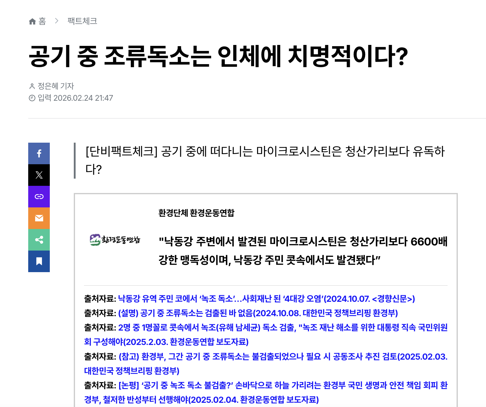 낙동강 유역 인근 공기 중 조류독소(녹조라는 조류에서 나온 마이크로시스틴이란 독소) 검출 여부를 둘러싼 환경단체와 환경부(현 기후에너지부)의 공방이 수년째 이어져왔다. 지난 10일 기후에너지부는 낙동강 본류 5개 지점을 환경단체와 공동으로 조사한 결과, 공기 중 조류독소는 검출한계 미만(불검출)으로 확인되었다고 발표했다. 민관 공동 조사를 시작하며 갈등은 일단락됐지만, 이번 조사는 지난해 9월 15일부터 25일까지 진행된 것으로, 향후 녹조가 극심한 8월~9월 초에 조사할 경우 조류독소가 검출될 가능성도 배제할 수 없다. 기후에너지부도 지난해 시작된 민관 공동 조사는 준비 과정이 길어지면서 조사 시작 시점이 9월 중순으로 늦었고, 올해부터는 보다 공동 조사를 빠르게 시작한다는 입장이다.