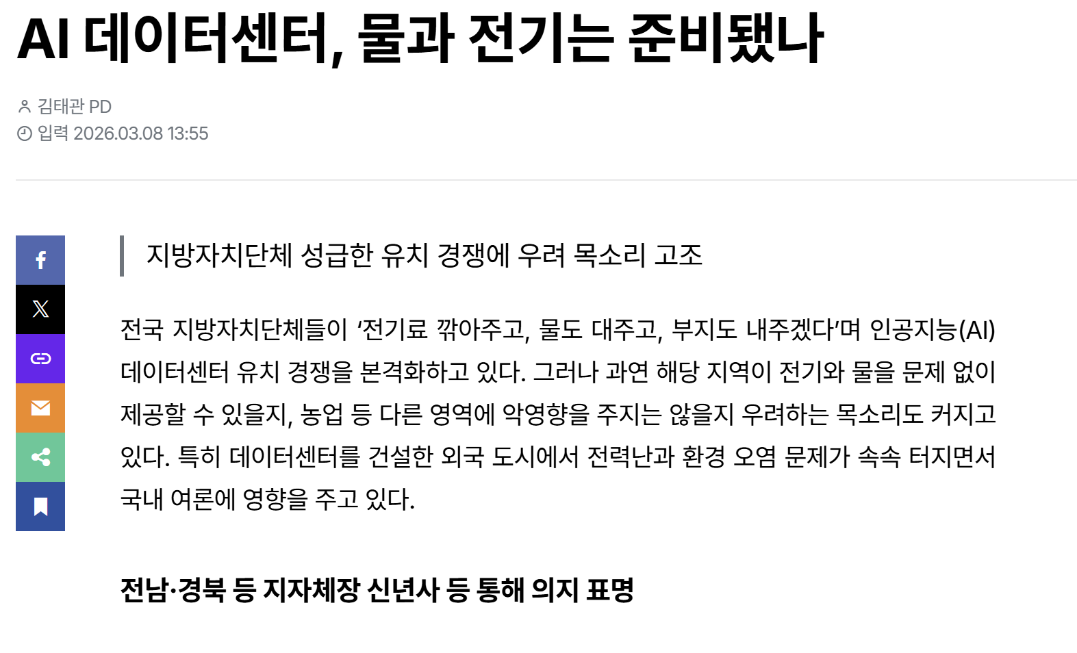 전국 지방자치단체들이 ‘전기료 깎아주고, 물도 대주고, 부지도 내주겠다’며 인공지능(AI) 데이터센터 유치 경쟁을 본격화하고 있다. 그러나 과연 해당 지역이 전기와 물을 문제 없이 제공할 수 있을지, 농업 등 다른 영역에 악영향을 주지는 않을지 우려하는 목소리도 커지고 있다. 특히 데이터센터를 건설한 외국 도시에서 전력난과 환경 오염 문제가 속속 터지면서 국내 여론에 영향을 주고 있다.