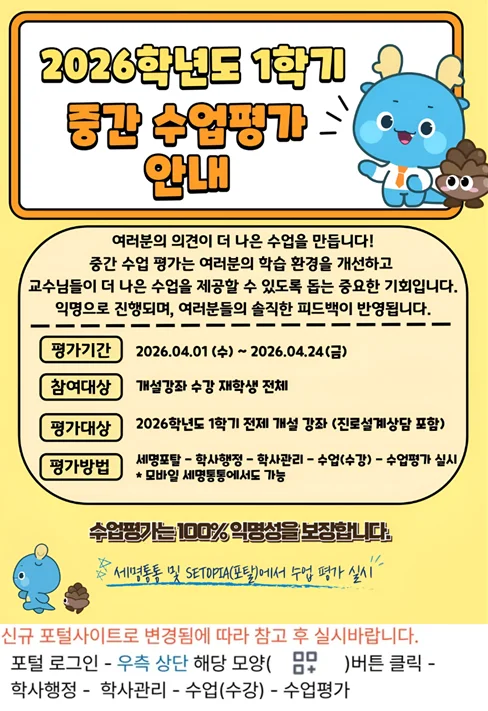 본문 시작 공지사항 세명소개 입학/취업 대학/대학원 학사지원 대학생활 연구/산학 기관/시설 SMU Story 소통·공감 학교기업 홈페이지가이드 일반공지 News@SMU 공지사항 보도자료 Media SMU 민송백일장 해카톤 경진대회 일반공지 페이스북 트위터 프린트 ★기간 연장★ 2026-1학기 전체 재학생 대상 중간수업평가 참여 안내 교수학습개발센터 조회:29 등록일:2026-04-17 중간수업평가 연장공지 홍보물.png 여러분, 안녕하세요. 교수학습개발센터입니다. 중간 참여 수업평가 참여 기간을 연장하오니 재학생 여러분들의 많은 참여바랍니다. ※ 중간수업평가 결과조회 시기 및 방법은 추후 별도 안내 예정입니다. 대학교육혁신원 교수학습개발센터장 목록 담당부서 : 세명대학교 담당자 : 세명대학교 연락처 : 043-645-1125 최종수정일 : 2024-10-26 만족도조사 만족도 조사 이 페이지에서 제공하는 정보에 대하여 만족하시나요? 매우만족 만족 보통 불만족 매우불만족