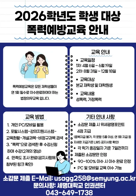 폭력예방교육은 법정의무교육으로 모든 재학생들이 연 1회 필수로 이수완료하여야 합니다.